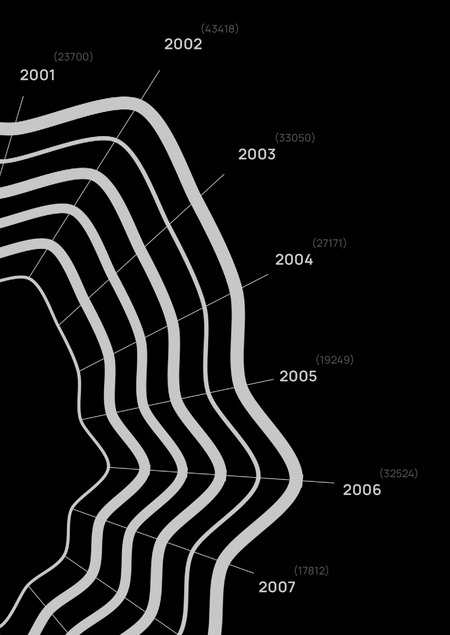Я нашёл информацию о количестве лесных пожаров по годам на сайте ЕМИСС и интерпретировав это в базу данных, получил вот такую приятную и вполне природную визуализацию.