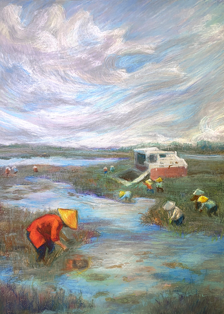 Серия работ «Сезон урожая» представляет из себя сюжеты с изображением сбора урожая в разных странах. Первая работа посвящена Японии, на которой фермеры-японцы собирают урожай риса. Вторая работа изображает Грузию, где местные жители трудятся на виноградном поле. Третья — иллюстрирует местный праздник сбора клубники в Финляндии, на которой изображена ярмарка и клубничные поля за ней.