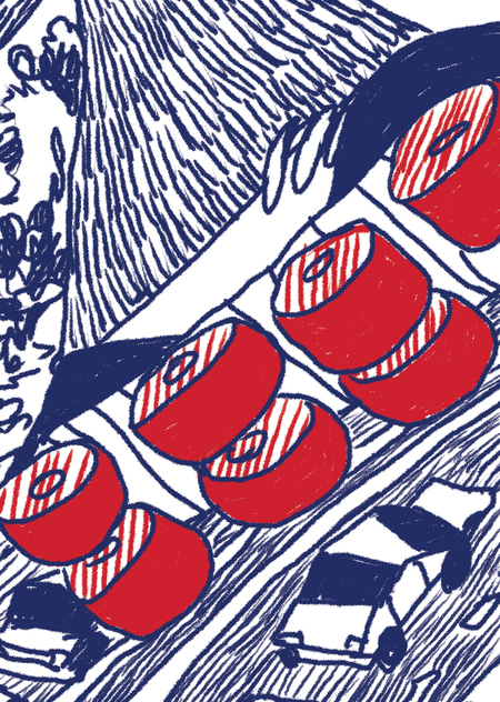 Иллюстрации выполнены в контексте легкого сумасшествия и всплеска энергии. Все эти картинки о социуме и взаимодействии с ним, скорее о тех моментах, когда социум вызывает у человека сильные эмоции, и он совершает решительные поступки. Герои, можно сказать, слетают с катушек. Пара людей отправились на плоту с холодильничком отличного пива сплавляться по реке подальше от людей, чтобы успокоить мысли и побыть наедине с природой. Следующая идея: герой не выдержал тухнуть в огромном скоплении людей в пробке по пути на работу, и он полетел по делам на роликах. Последняя же иллюстрация: соединение совсем разных людей за общим занятием перетаскивания холодильника вверх по лестнице. Тут и дословный смысл подъема, который использует бренд, и идея объединения в своеобразном деле.