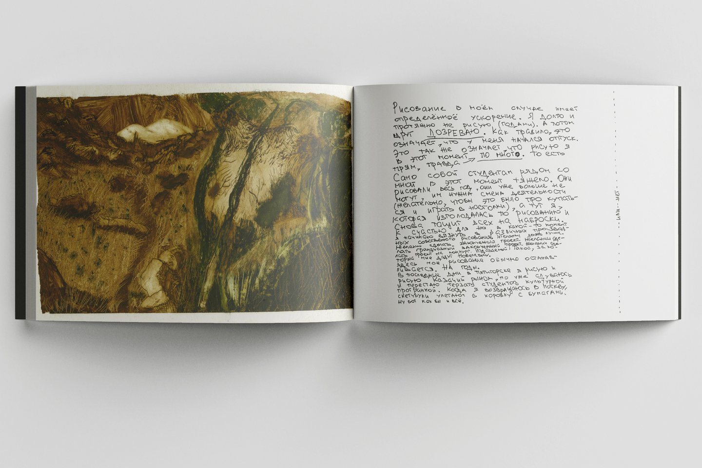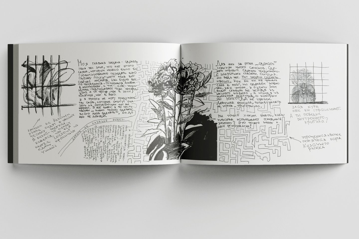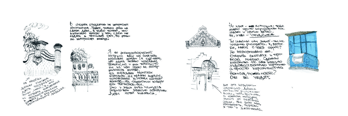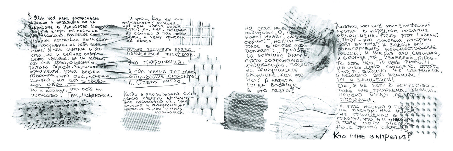 Летом 2023 года я приняла участие в саморезиденции «Безмятежного рисования», в рамках которой художники не только исполняли свои проекты, но и отслеживали, как выстраивается их работа, как они справляются с организацией творческого процесса и с какими трудностями сталкиваются. Для меня эти вопросы имеют особое значение, поскольку не только я, но и мои студенты вынуждены ежедневного преодолевать давление тех представлений о месте художника, с которыми воспитывают каждое новое поколение. Результатом моей работы стал зин-исследование. В нем я анализирую те сложности, с которыми сталкиваюсь в творческой работе, и ищу пути их преодоления.