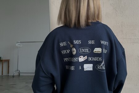 Принт сзади — «she says she won’t stop until her pinterest boards become a reality» (перевод — «она никогда не остановится, пока её мечты из пинтереста не станут реальностью»)