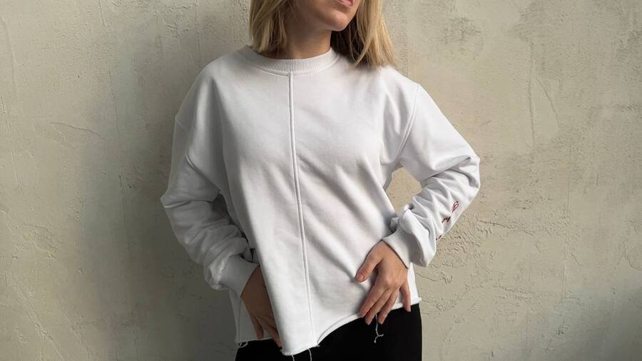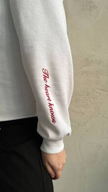 Белый минималистичный свитшот единого oversize размера с алой вышивкой на левом рукаве.