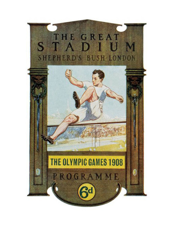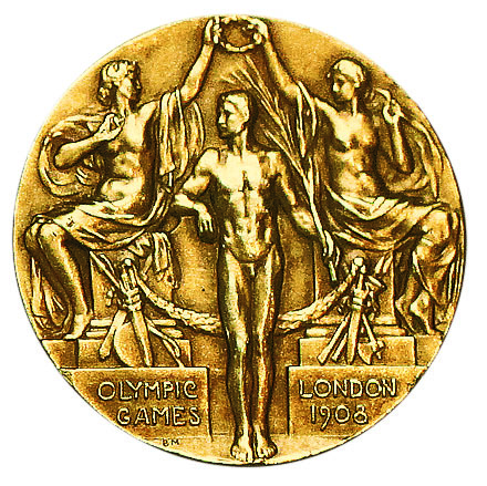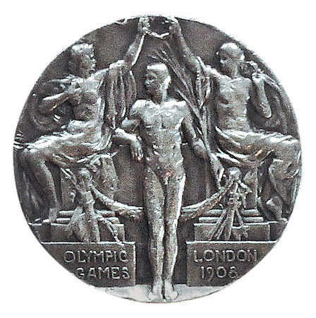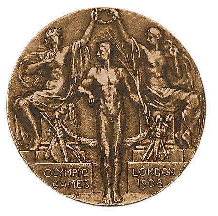 Аверс: атлет-победитель и две женские фигуры, возлагающие на его голову венок. У подножия пьедесталов — перевязанные лентой воинские атрибуты: меч, щит, стрелы, лук — как напоминание, что войны на время Олимпийских игр должны быть прекращены. Внизу слева и справа в две строки по-английски: OLYMPIC GAMES (Олимпийские игры) и LONDON 1908 (Лондон 1908).