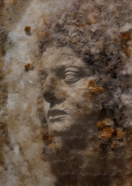 prompt = «a face of an ancient statue, half-hidden under layers of dirt, in the style of Gerhard Richter, texture with visible smears»