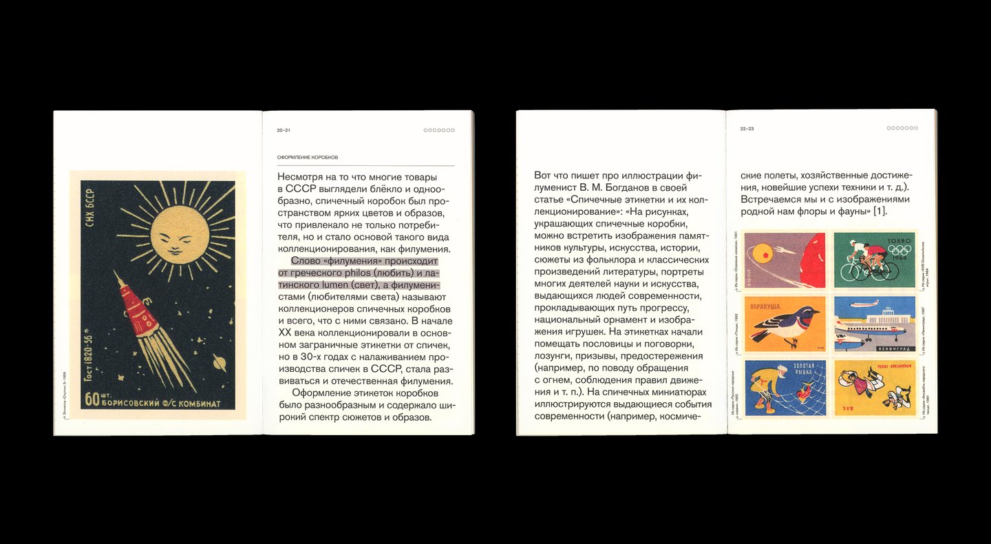 The book is devoted to the study of the visual image of the labels of the collection sets of matchboxes of the USSR. The purpose of the study was to examine the stories and motives that were most commonly placed on labels and to analyse how Soviet graphic artists dealt with the problem of spatial and plot limitations in working on the visual component of the box.
