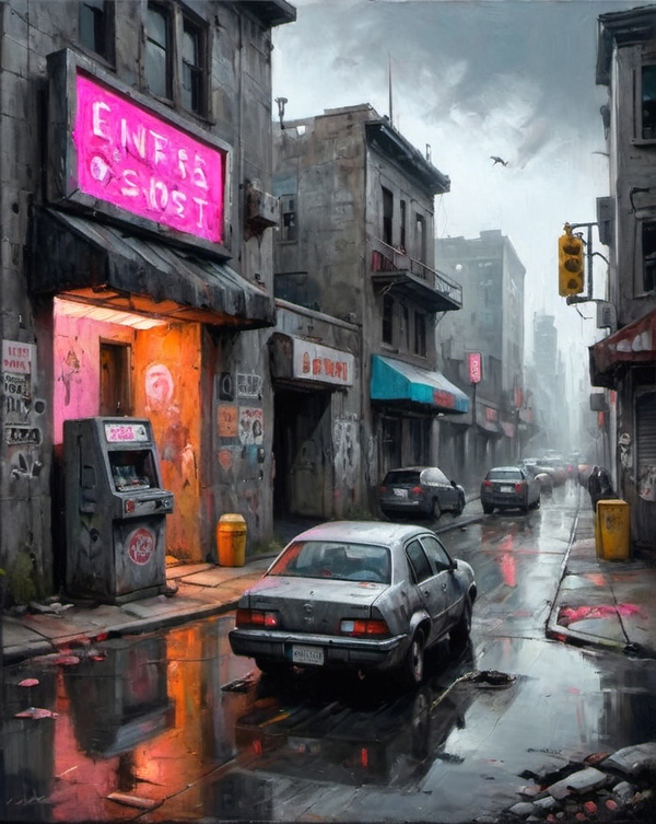 A lifeless city of gray concrete with neon signs and posters, whose sole purpose is to become a haven for dark ghosts who cannot stand light and color.