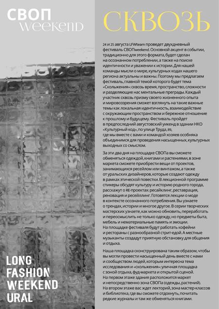 24 августа, вход свободный 12:00 — 20:00 Лекторий; Работа маркета ресейлеров и samplesale от уральских дизайнеров 13:00 — 19:00 Мастер-классы 14:00 — 19:00 Работа концертной площадки (улица) 15:00 — 17:00 СВОП вещами 17:00 — 18:00 СВОП книгами и растениями 19:00 — 21:00 Перерыв и переоборудование площадки под закрытую часть 21:00 — 23:00 Фортепьянный концерт от Настасьи Хрущевой — «Русские тупики». Вход по билетам.