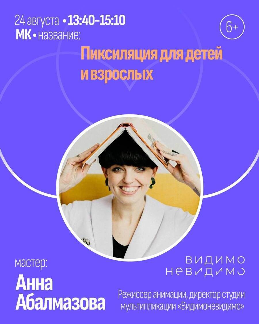24 августа 13:40–15:10 // Анна Абалмазова директор студии мультипликации «Видимоневидимо» показала всем желающим, как снимать мультфильмы дома на телефон и воплощать свои «видимоневидимые» фантазии.