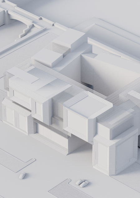 Для фасадов структура дворов-колодцев Санкт-Петербурга была зафиксированная на спутниковых снимках. Я взяла скриншот фрагмента городской карты и перенесла ритм и форму колодцев на фасады здания музея. Таким образом, архитектура буквально «сшита» из ткани города — фасады не выдуманы, а «вырезаны» из реального Петербурга.