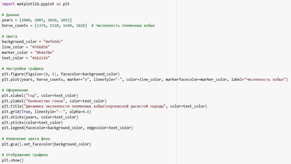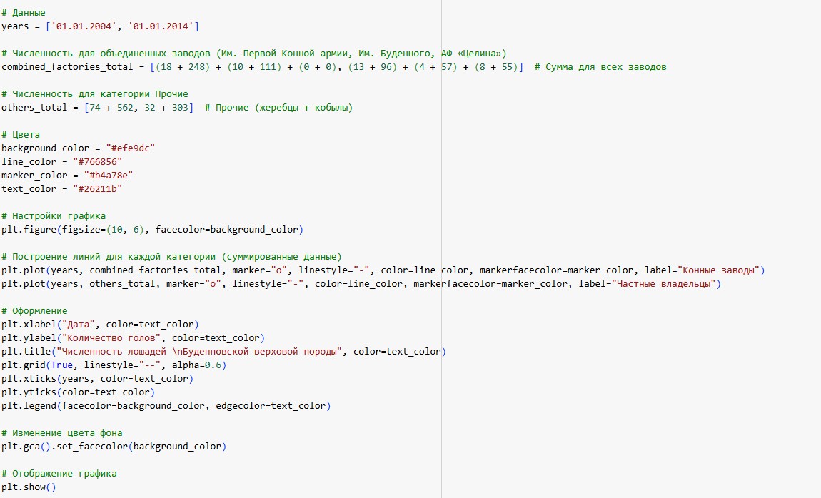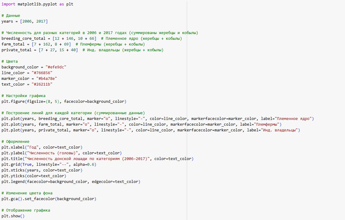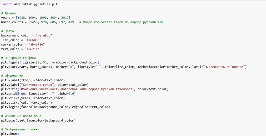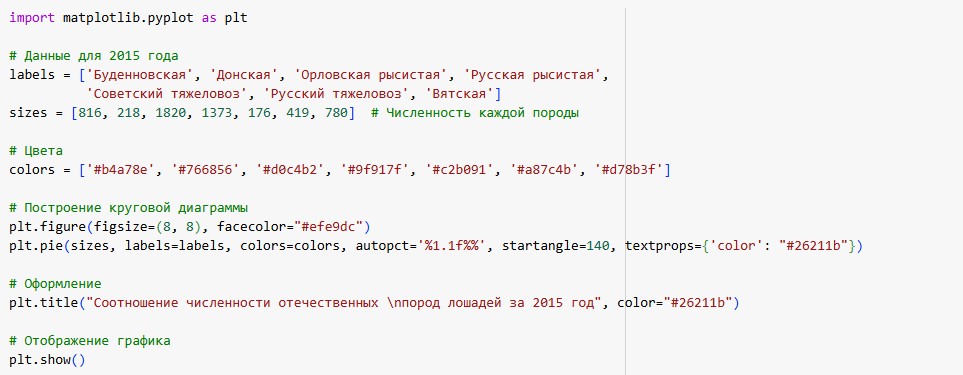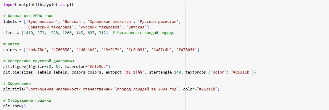 Исходные данные были собраны из официальных статистических источников и специализированных отчетов по коневодству в России. Анализ выполнен с использованием визуализаций, представленных в виде линейных графиков и круговых диаграмм. Линейные графики демонстрируют динамику изменения численности лошадей по годам, а круговые диаграммы помогают наглядно отобразить соотношение различных пород в общей структуре отечественного коневодства.