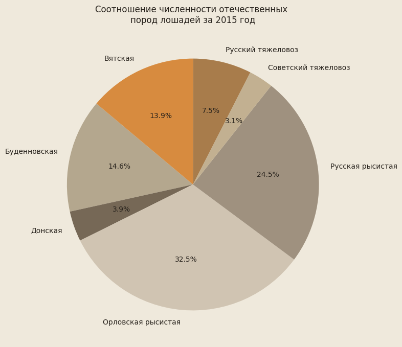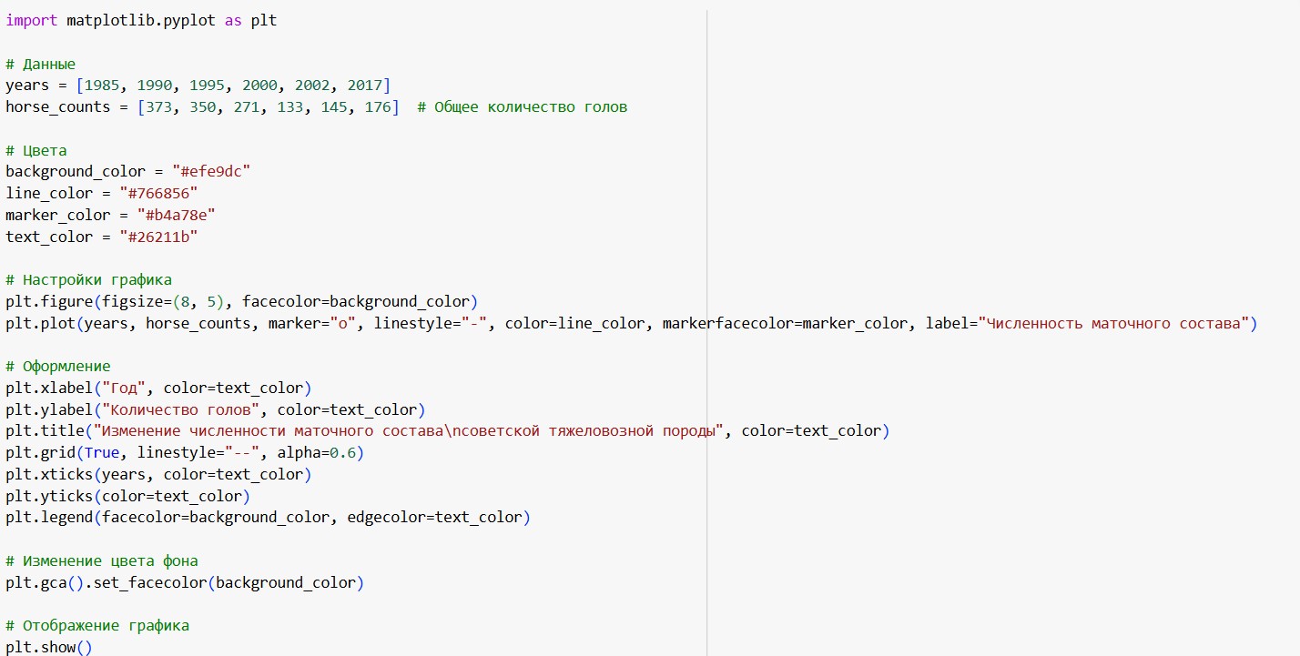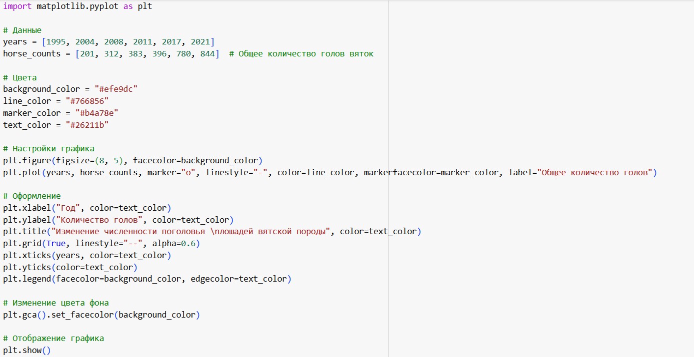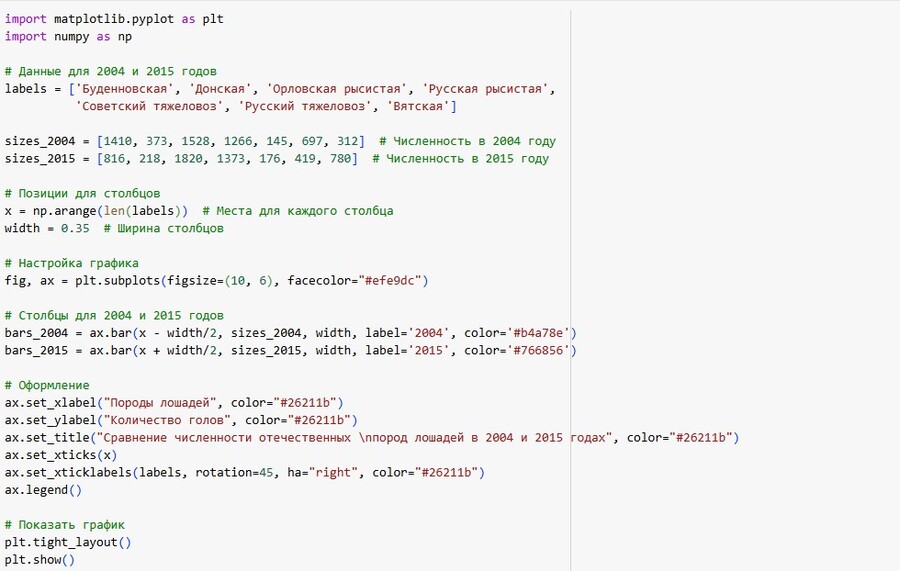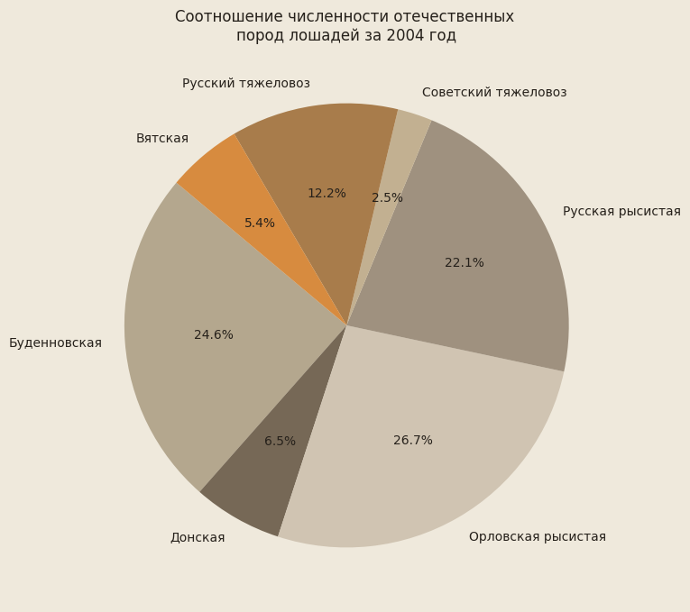 Исходные данные были собраны из официальных статистических источников и специализированных отчетов по коневодству в России. Анализ выполнен с использованием визуализаций, представленных в виде линейных графиков и круговых диаграмм. Линейные графики демонстрируют динамику изменения численности лошадей по годам, а круговые диаграммы помогают наглядно отобразить соотношение различных пород в общей структуре отечественного коневодства.