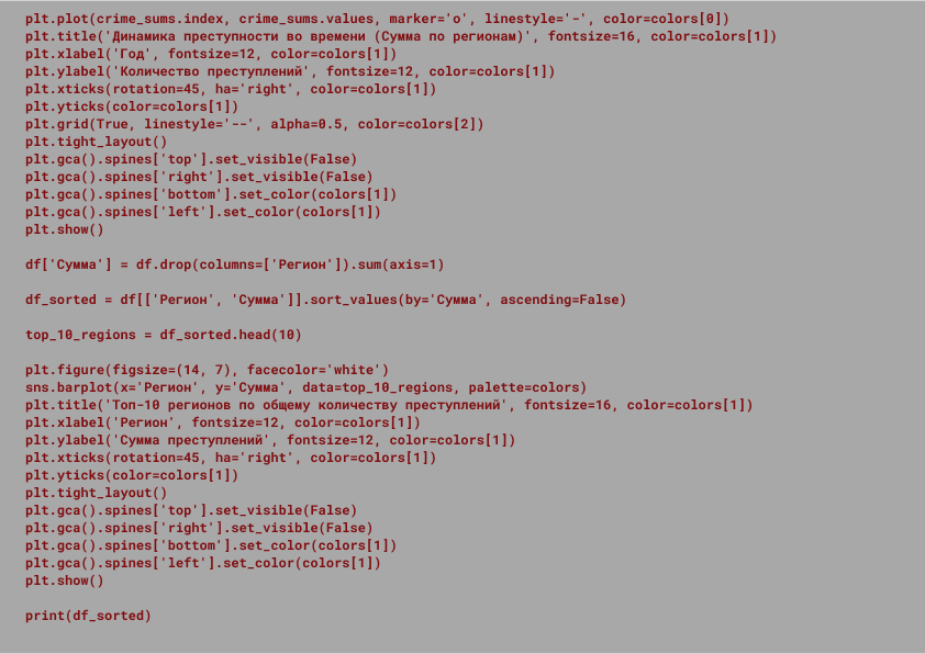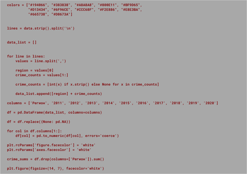 Я всегда увлекалась True Crime тематикой, однако в основном изучала зарубежные дела, поэтому мне стало интересна именно Российская статистика преступлений. Этот проект направлен на выявление ключевых тенденций, закономерностей и проблемных зон в сфере преступности на территории РФ. Проблема преступности является одной из наиболее острых и важных для любого общества, именно поэтому понимание тенденций и закономерностей в этой сфере необходимо. Несмотря на то, что данные, найденные и проанализированные мной могут быть не до конца прозрачными и не слишком свежими ввиду законодательства Российской Федерации, я считаю что важно говорить о подобной статистике и обращать на нее особое внимание, так как повышенный уровень преступности — острая социальная проблема любого общества.