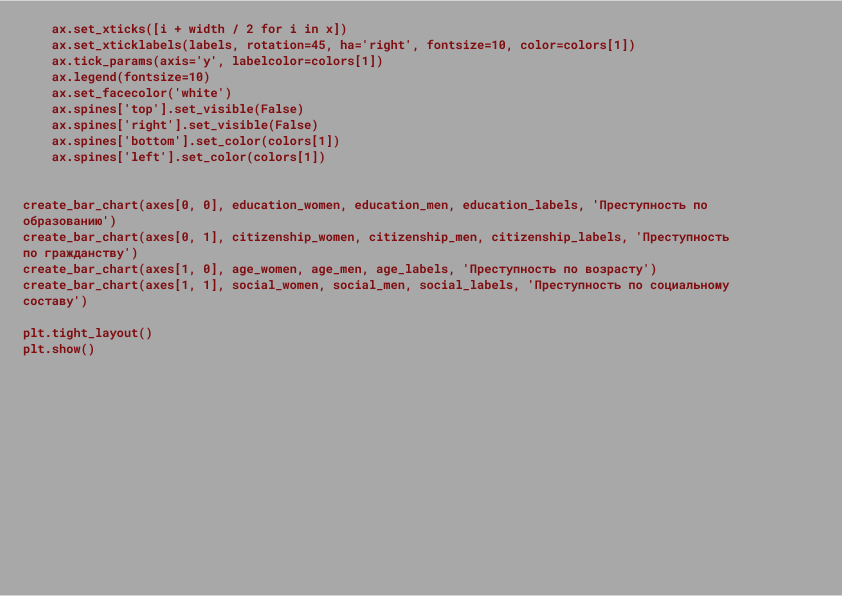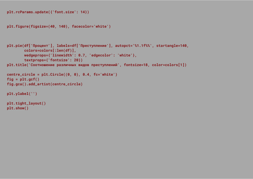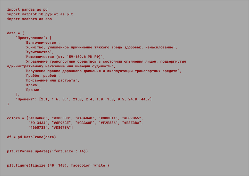 Я посчитала эти виды визуализации наиболее наглядными. С помощью них можно доступно показать динамику роста\спада уровня преступности, соотношение разных видов преступлений или показать «социальный портрет» среднестатистического преступника, основанный на нескольких составляющих.