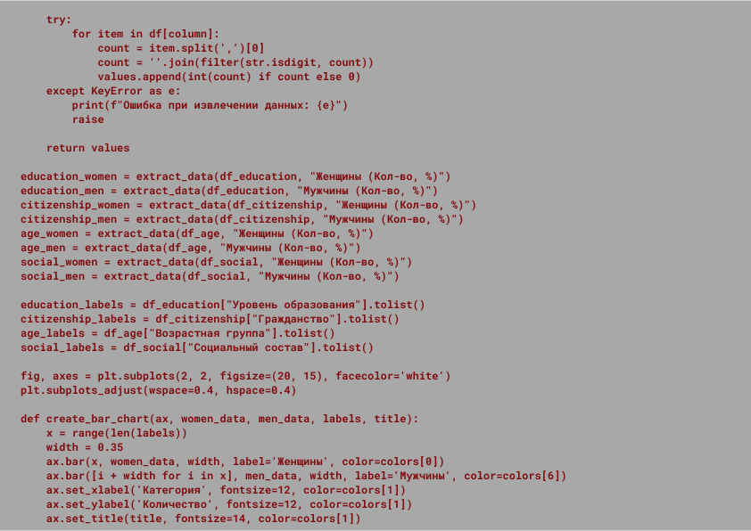 - Количество преступников среди мужчин в разы превшает количество преступников среди женщин. Причиной этому может быть большое количество, однако в данном аспекте не считаю возможным с уверенностью говорить о них. - Наибольшее количество преступление совершают люди 30-49 лет, что говорит о том, что старение региона и несбалансированность может негативно повлиять на статистику преступной деятельности внутри региона