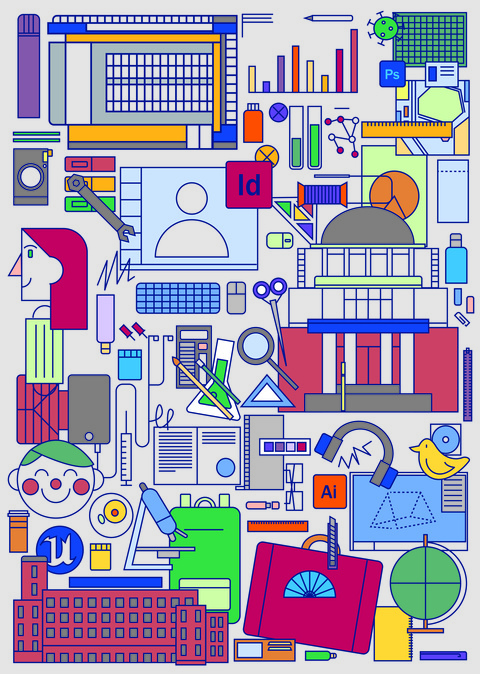 Проект по разработке принтов по брифу о ВШЭ. Я создала модульный паттерн, который можно компоновать на разных форматах, создавая новый рисунок из набора базовых элементов, связанных со студенческой жизнью.