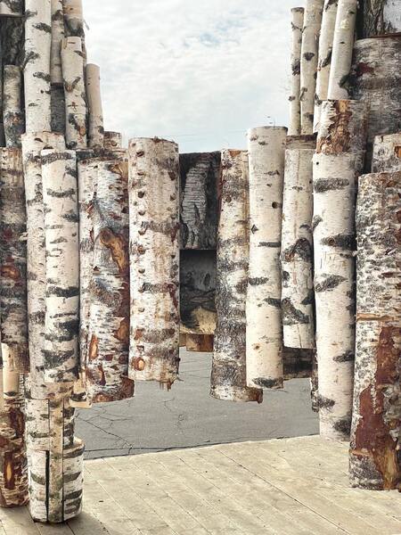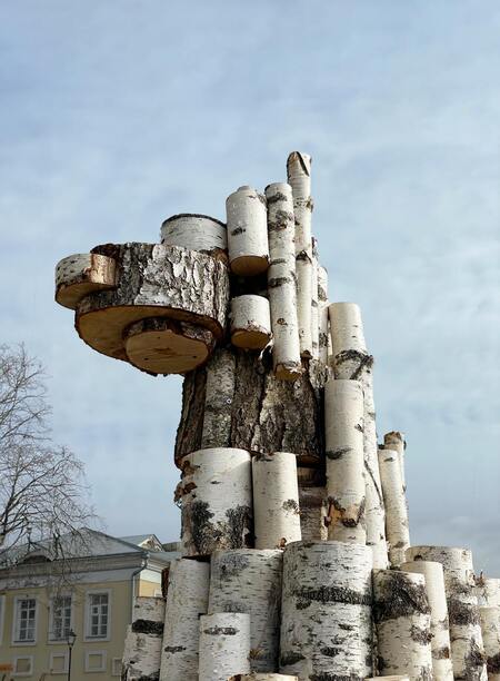 По этому принципу сконструирован центральный двухголовый конь — скульптура, связанная с уходящим в археологию и распространенным в народных промыслах образом. После сказки Корнея Чуковского его стали называть «Тяни-Толкай». Зритель может принять участие в игре через интерактивные объекты — потянуть и толкнуть детали березового конструктора. Из этих бревен можно собрать народный конструктор-головоломку — «Шаркунок». При компоновке нескольких березовых стволов появляется оптическая иллюзия — границы бревен теряются, и образ сливается воедино, что одновременно напоминает эффект головокружения от русского хоровода и цифровые помехи, компьютерный «глитч».