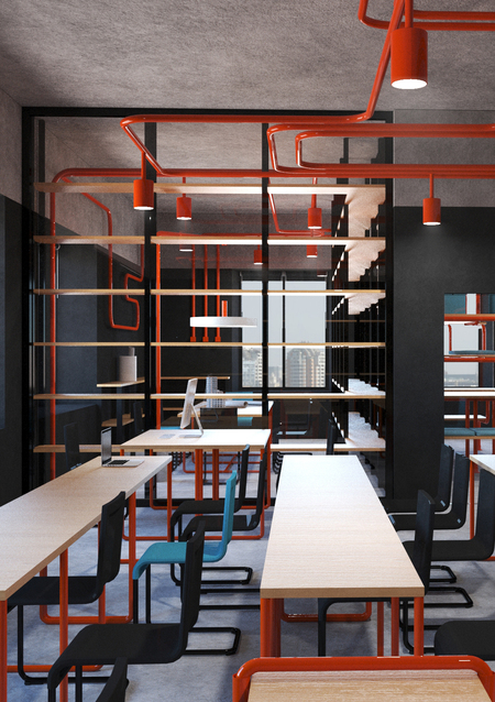 Коворкинг — многоярусная конструкция универсального применения. Вариативна в использовании тем, что обладает свободным расположением рабочих плоскостей. Подобный прием позволяет видоизменять рабочую позу студента, с целью повышения комфорта.