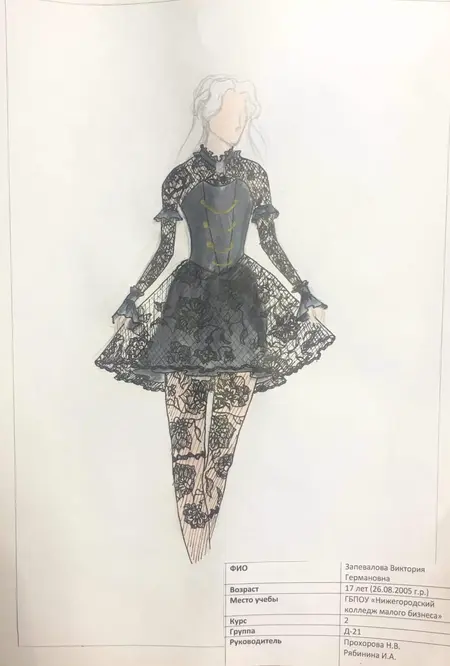 Меня очень вдохновляет эстетика одежды восемнадцатого-девятнадцатого веков. Я очень часто показываю это в своих рисунках и эскизах одежды. В этот раз я решила не отходить от своего любимого стиля. За основу было взято кукарское кружево чëрного цвета. Оно было выбрано потому, что кружева — неотъемлемые детали для создания шикарного образа в стиле тех времëн. В моей модели из кружева выполнены рукава, кокетка, юбка и колготки. Подъюбник и основная часть платья также чëрного цвета. Основную деталь платья украшают аксессуары золотого цвета. Сочетание чëрного и золотого — одно из моих любимых сочетаний, оно придаëт образу элегантость, а модели — аристократичный вид.