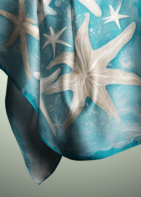 A delicate, elegant illustration designed for a pearlescent nautical-themed scarf, rendered in soft pastel tones of blue, turquoise, pearly-white, and sand. The centerpiece is a meticulously detailed arrangement of seastars each showcasing a captivating texture of pearlescent iridescence, subtle roughness, and natural curves. These starfishes are artfully scattered across a semi-transparent, pale blue background that subtly mimics the sea, with dappled light creating a gentle shimmer across the seastars surfaces. The composition evokes a sense of tranquility and refined coastal beauty, perfect for adorning a luxurious silk scarf.