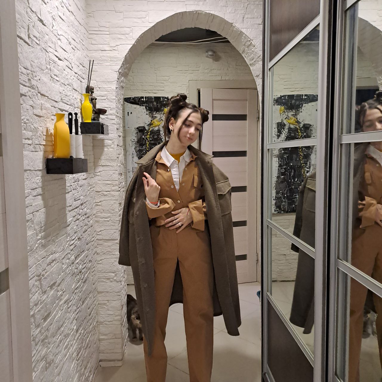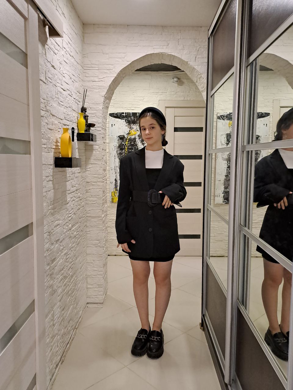 Я совместила в своих моделях элементы русского народного костюма и современной тенденции моды нашего времени. В своих эскизах я использовала несколько видов ткани, в том числе плотную ткань, расписанную узорами в русском стиле, ажурный, плотный, с красно-белыми узорами, плотный, гипюр на блейзере, также использовала в своих моделях Оренбургский платок, выполненный не в виде платка, а длинного палантина, который накрывает голову выполняет роль головного убора и накидки, которые согревает в прохладную погоду, ещё я использовала головной убор в виде чёрного платка имитирующую кожу, который завязывается сзади именно так, как женщины раньше завязывали платок работе по дому или на садовых участках, чтобы волосы не мешали, его можно использовать как с косами, так и распущенными волосами, концы платка должны торчать в разные стороны как указано на эскизах, также я использовала обувь с вышивкой, корсет с вышивкой и пояс в стиле русского севера.