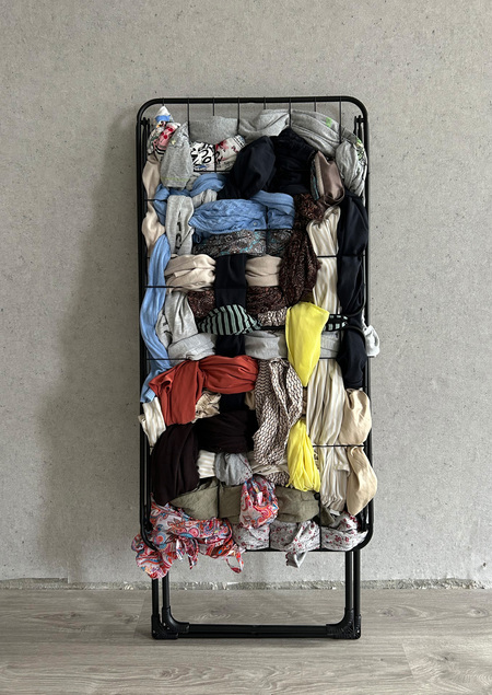 Обычно сушилка — вспомогательный для организации одежды предмет, но в этой работе она становится центральным элементом, вокруг которого образуется система методом вплетания одежды в пересечения прутьев. Она визуально напоминает сложные узоры плетения. Получается парадоксальная структура, сплетенная из одежды, которая тоже сплетена из нитей.