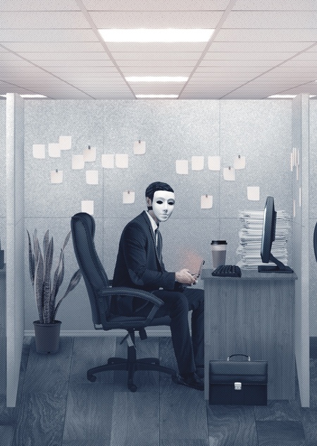The details of the game process and design reveal the setup and the issue of the world, which coincides with reality. The player ' s superiors monitor those below: corporate uroboros, where performance is based on monitoring the performance of the tasks, rather than directly performing them. The clerks wear masks. It’s a literal demonstration of corporate cloaking and antitopia, where people don’t have a person or a face, but there’s an indicator of performance.