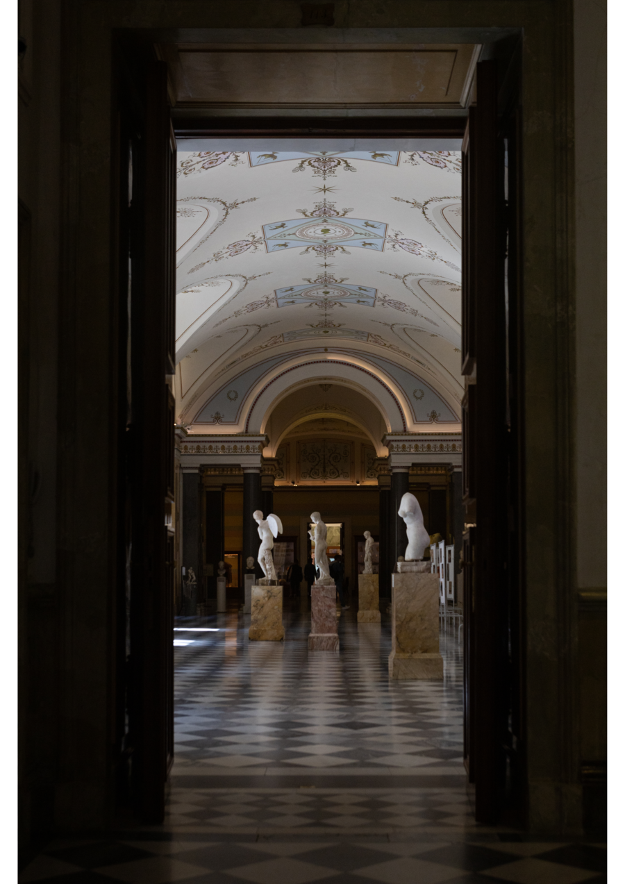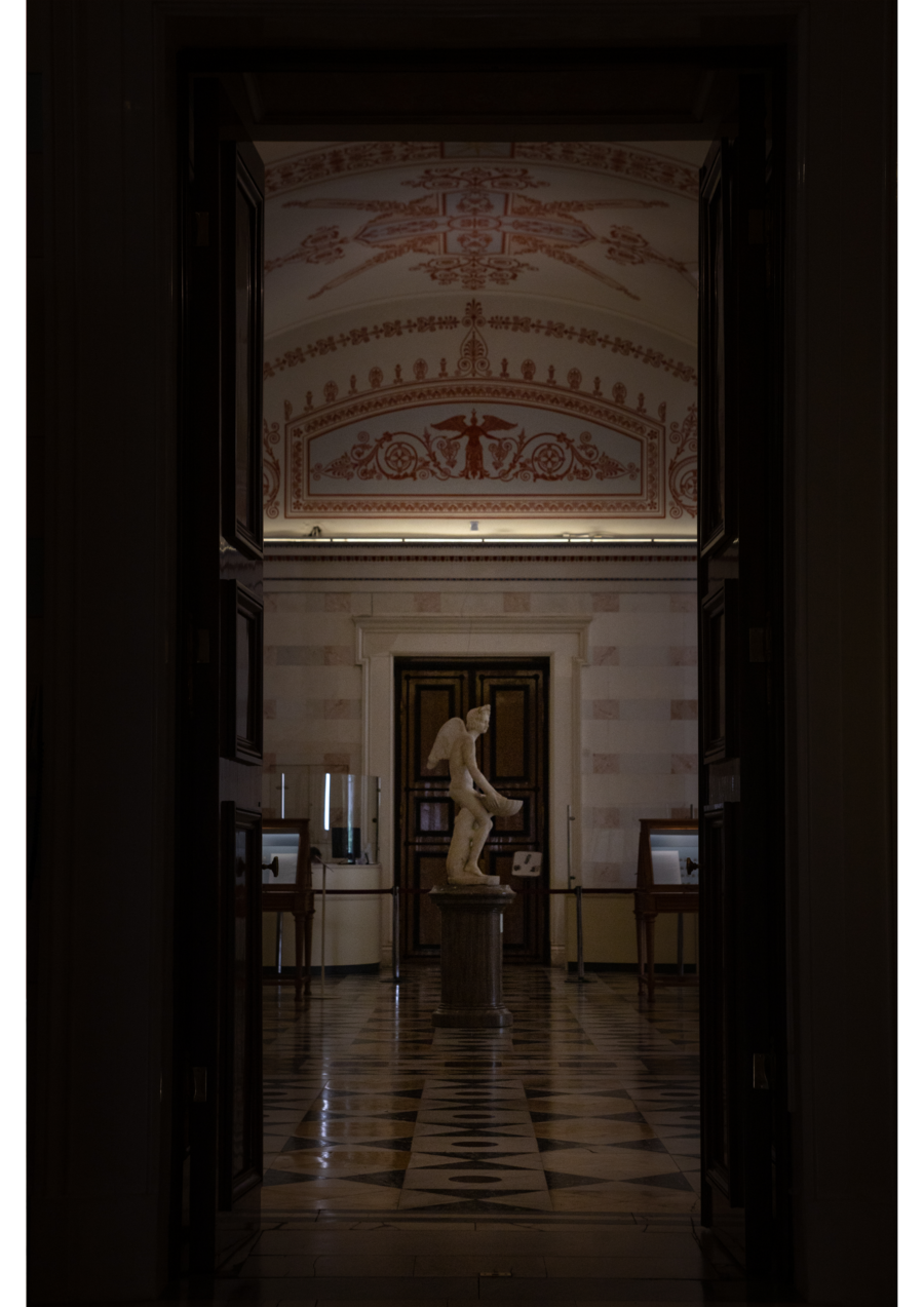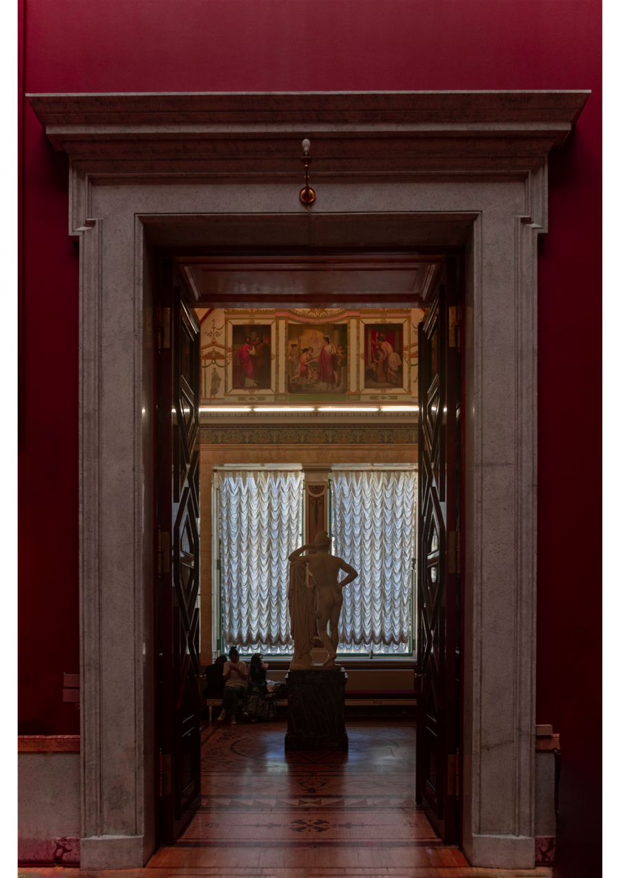 В этой серии фотографии показано каким образом пространство музея влияет на восприятие искусства. Длинные пролеты коридоров, цвет дверей, распределение света и тени.