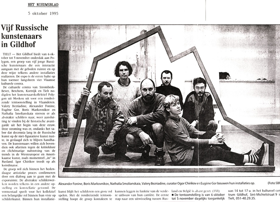 Художественное объединение «Полигон» в газете | 1995 | Наталья Смолянская на фоне инсталляции Евгения Вахтангова | 1991