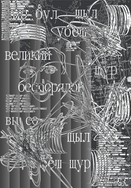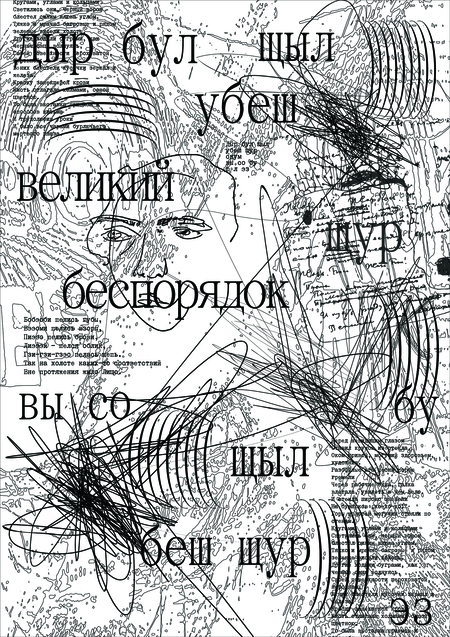 Плакат отражает эстетику хаоса, используя метафоры поэтической дисгармонии. Он включает стихотворение «Дыр бул щыл» Алексея Кручёных, которое играет с языком и смыслом, создавая атмосферу абсурда и неожиданности, в которой рождается поэзия