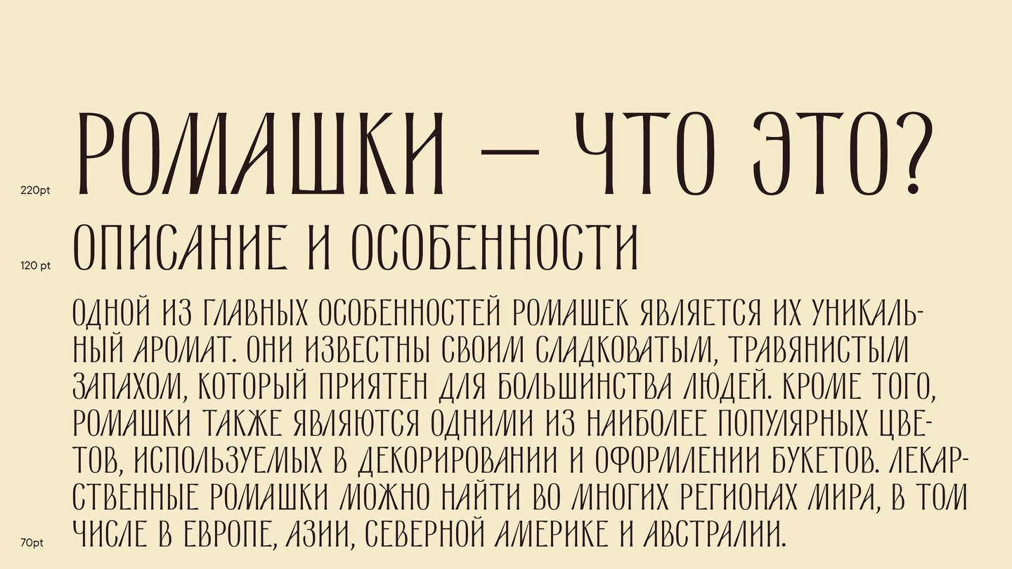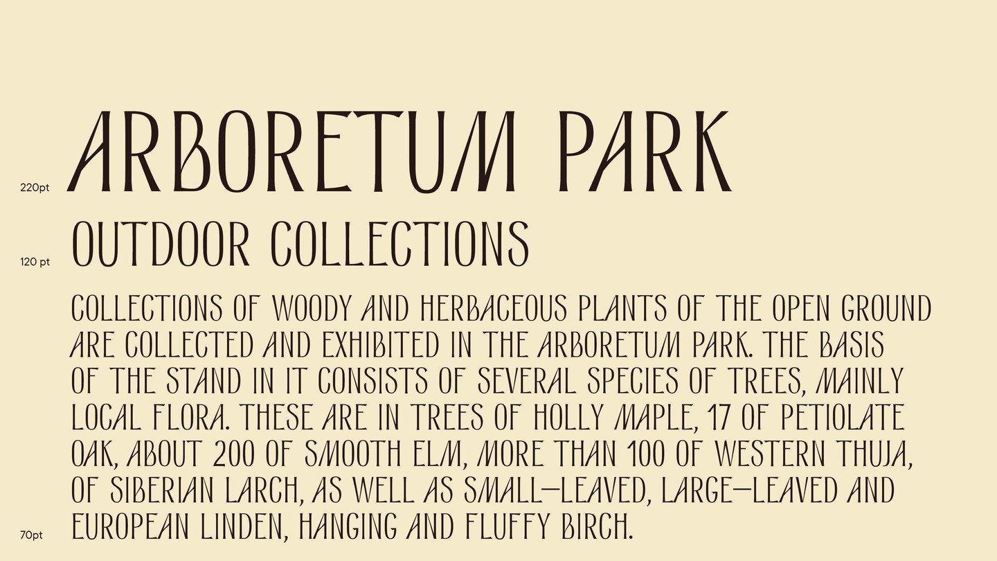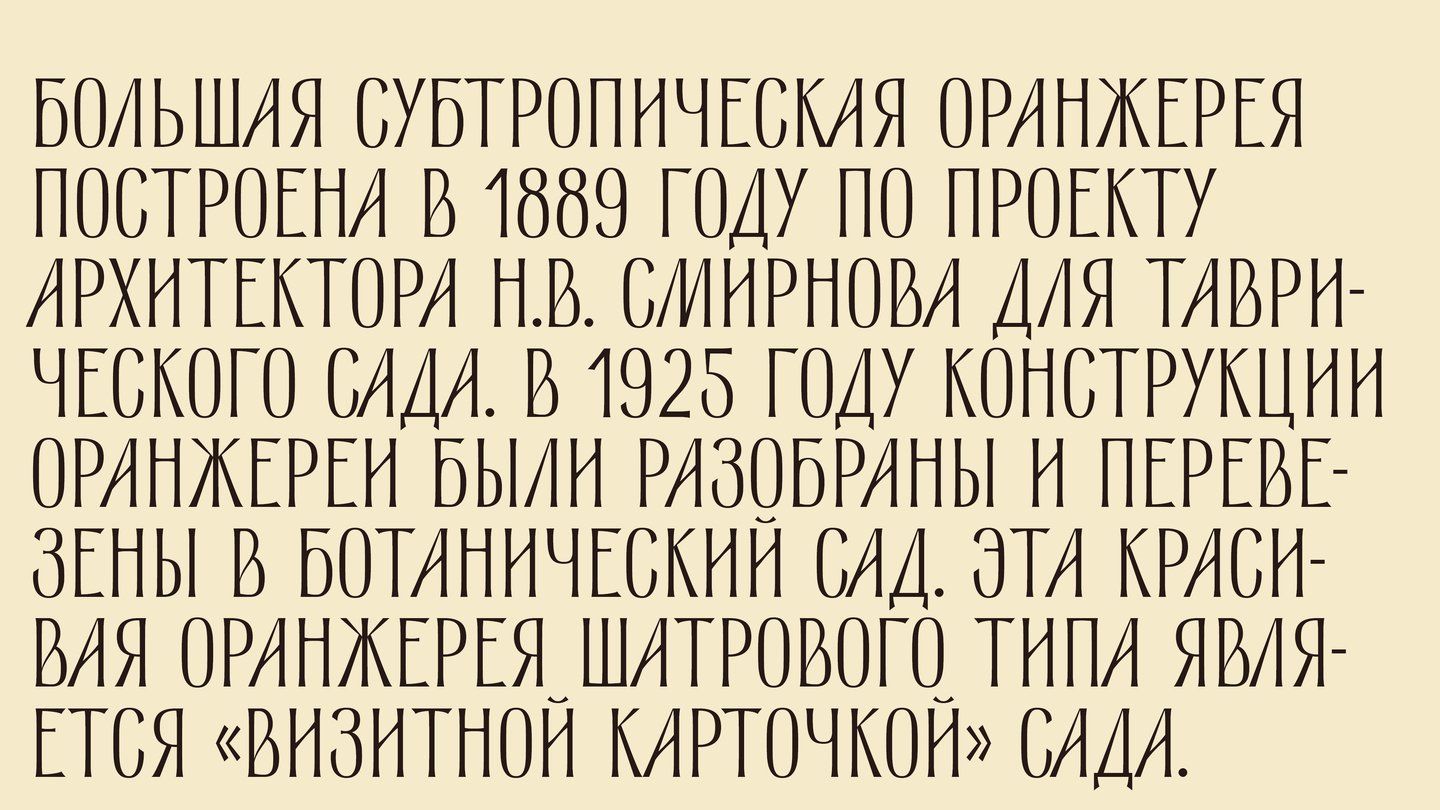 Стебель — ленточная антиква, вдохновленная шрифтом с советской книги по цветоводству. Строгий, как старый дуб, и временами мягкий и плавный, как мох, этот шрифт создавался для айдентики Ботанического Сада в Петербурге.