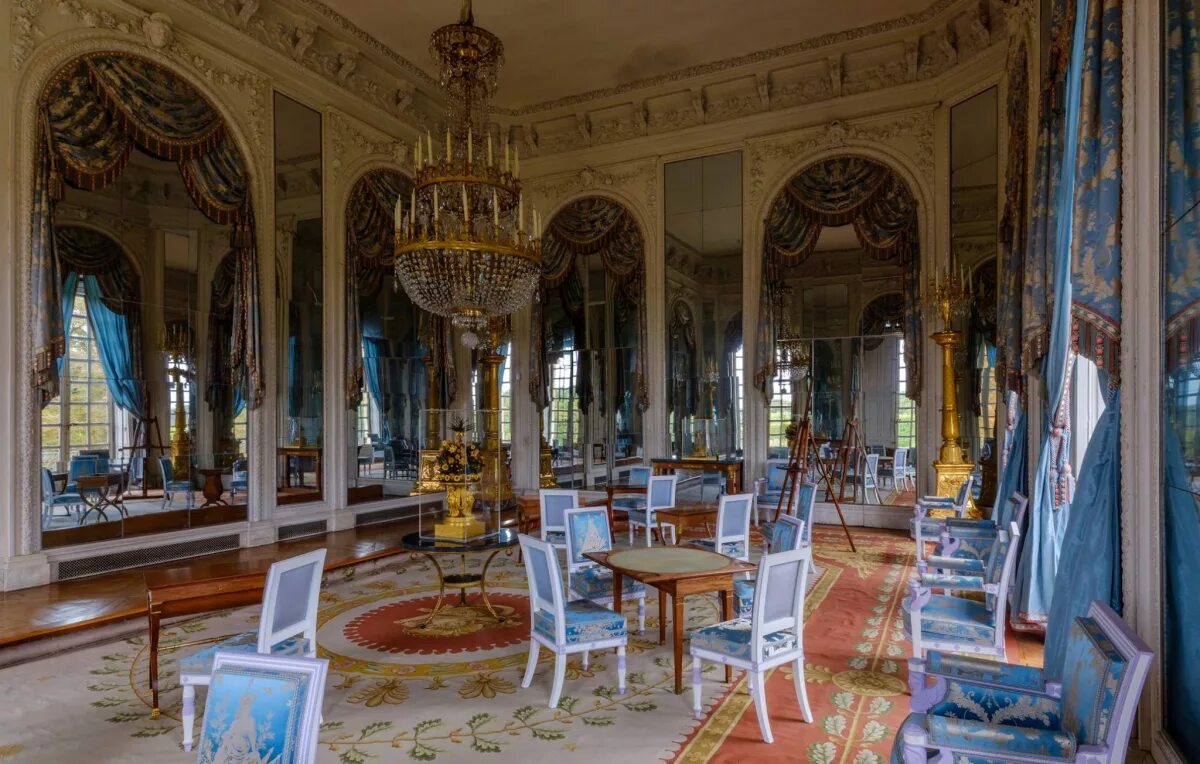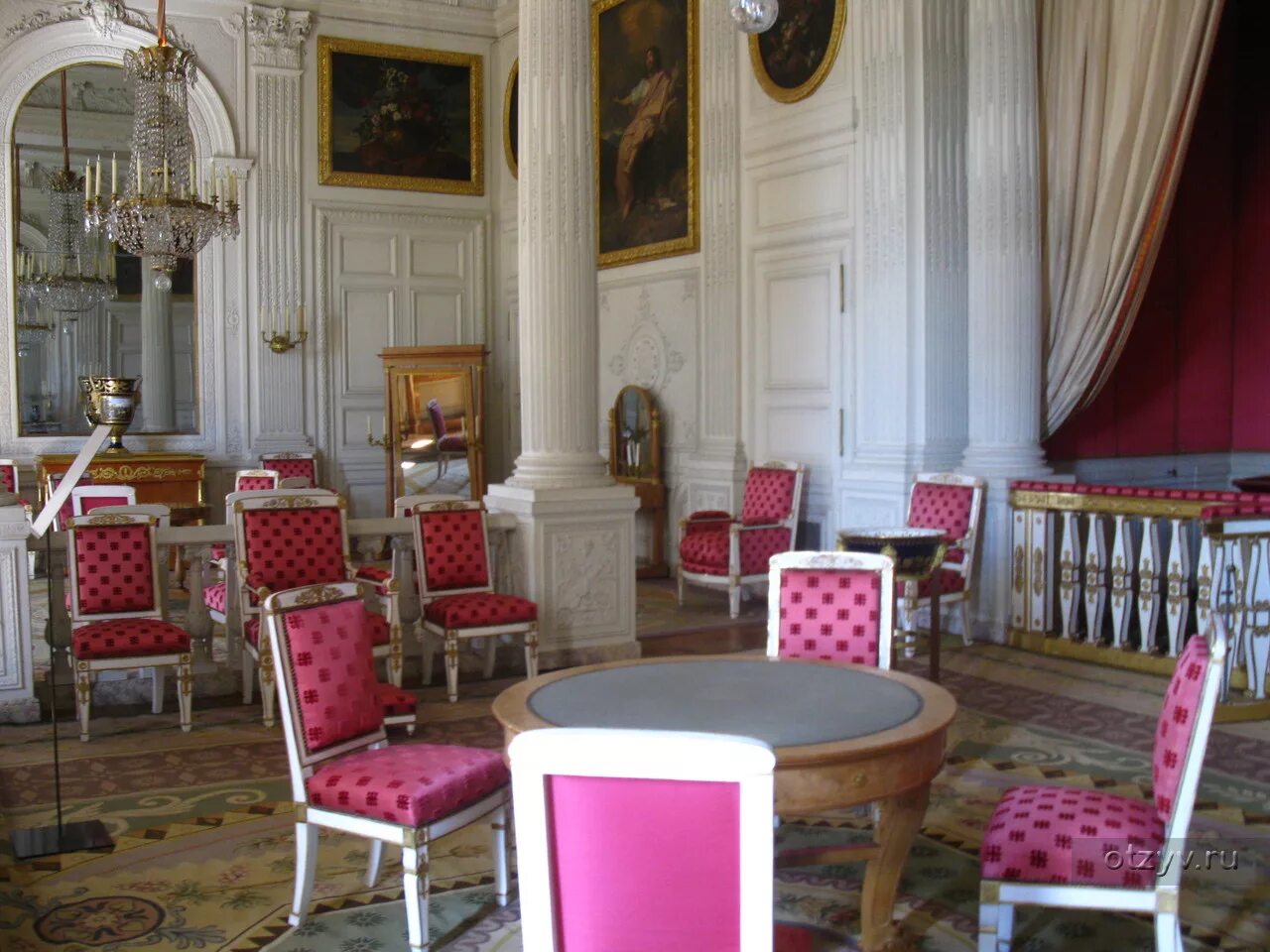 3. Дворец Версаль; Франция; Зал с массивной люстрой и стульями, которые обшиты шелковой тканью с интересным орнаментом.