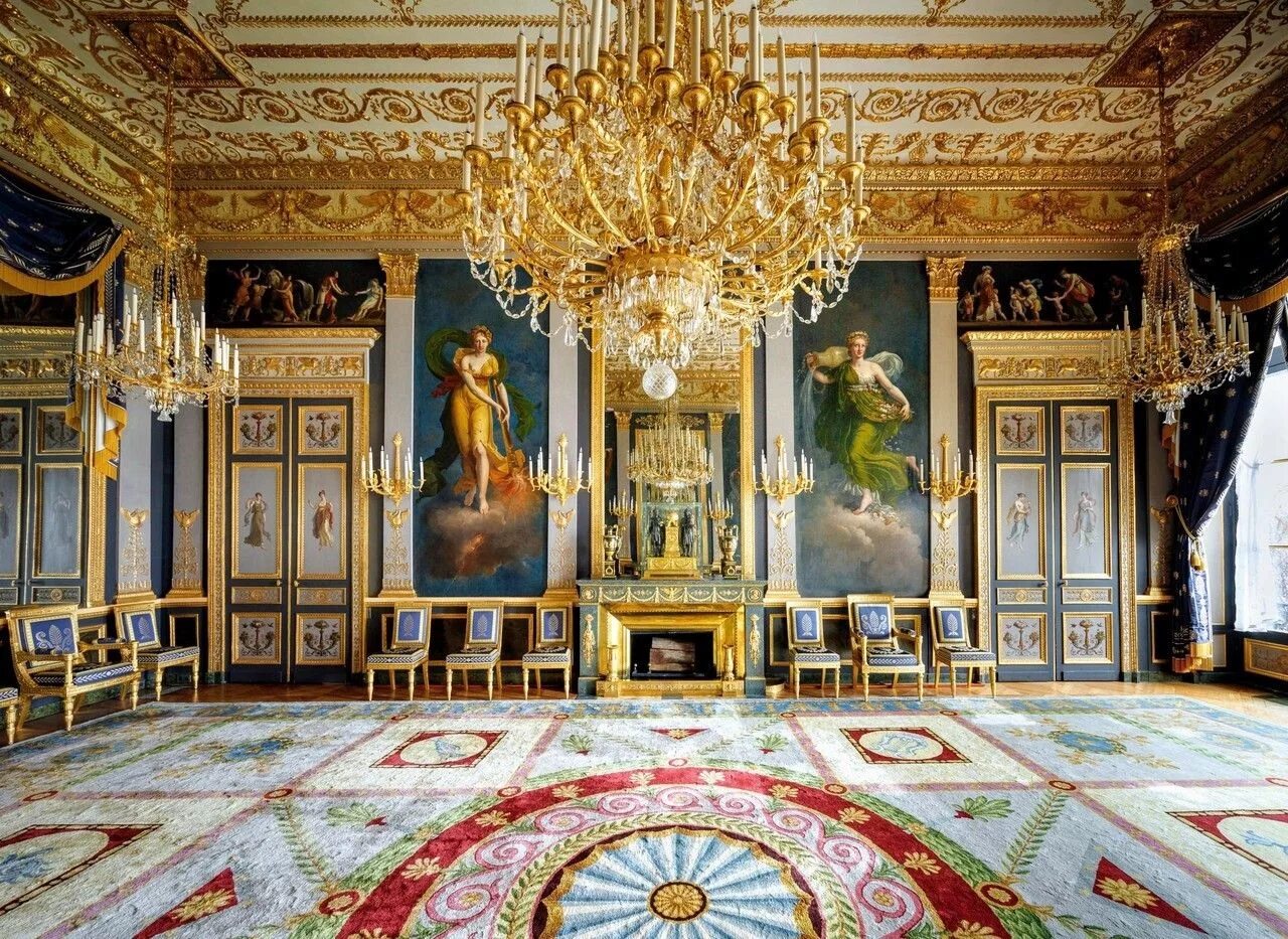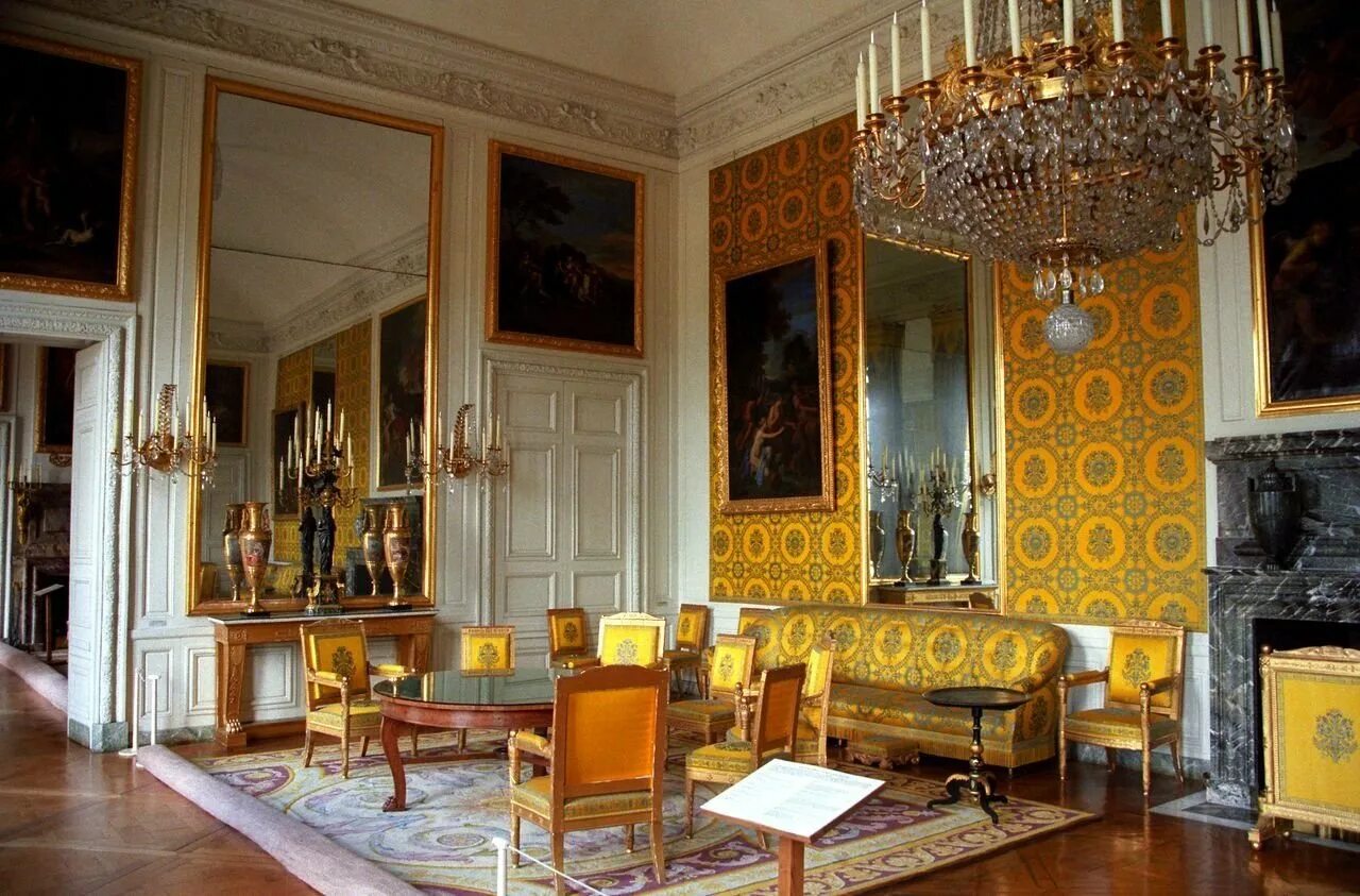 Дворец Версаль; Франция; Зал с ковром, массивной люстрой и мебелью в обивке.