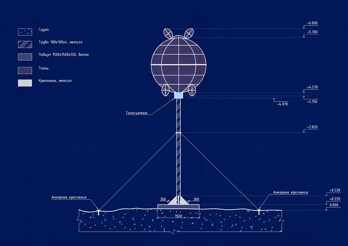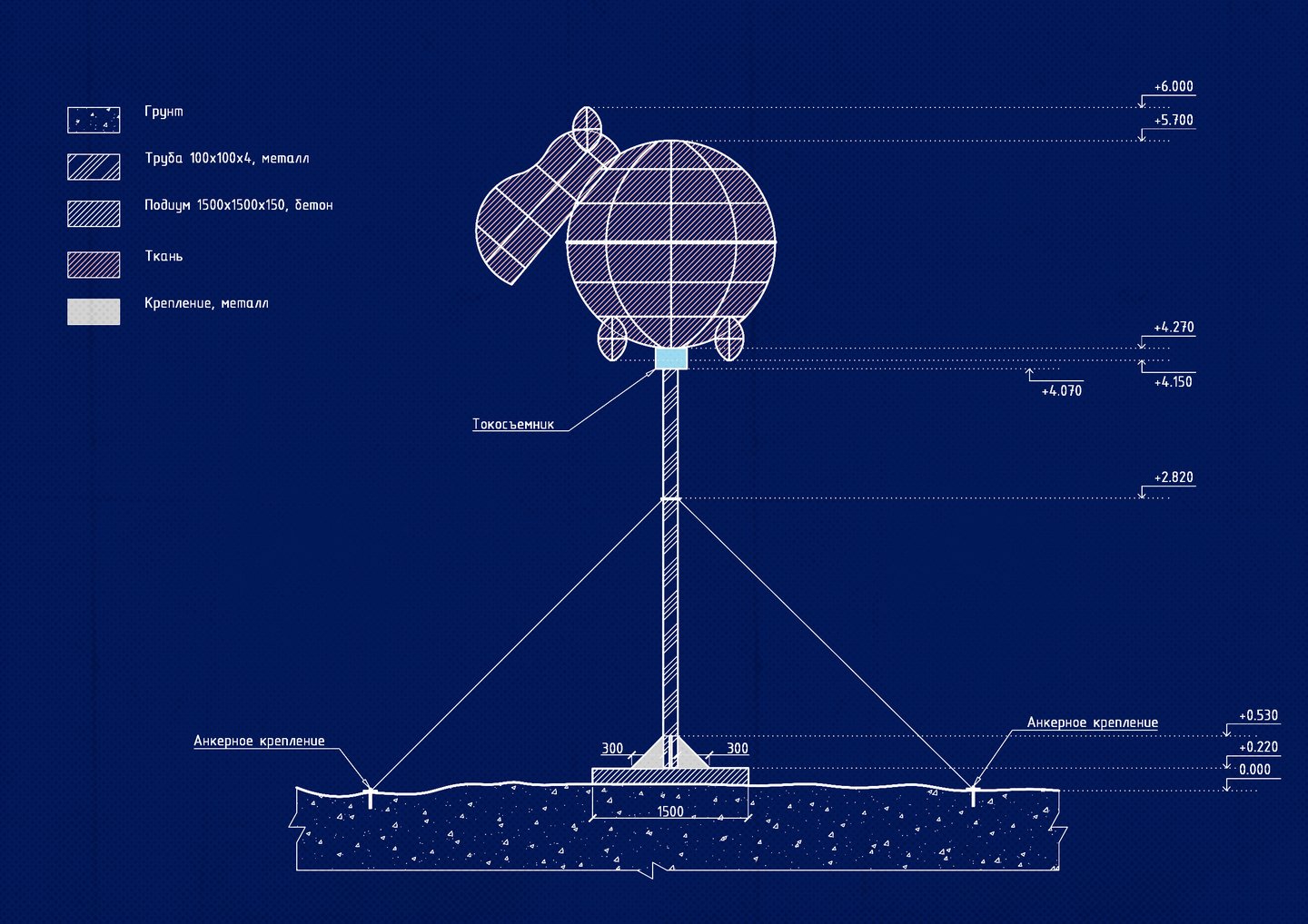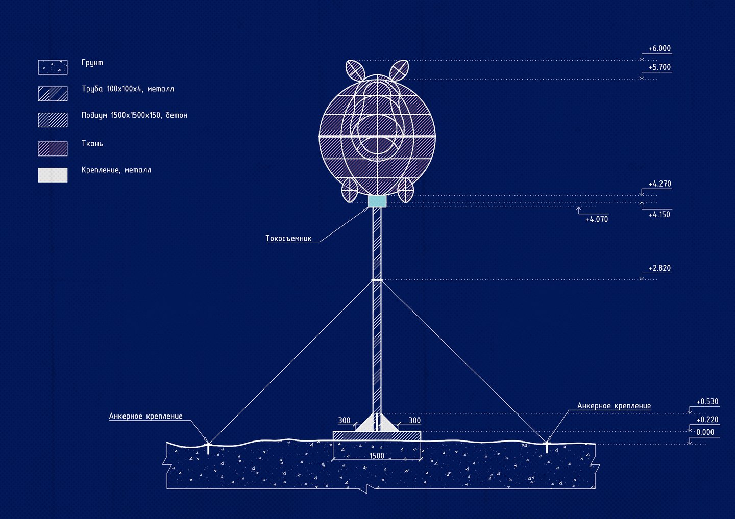 The design of the art object consists of a welding frame of a fixture wrapped with a rose-tight sheet underneath which a film protecting the flexible neon will be placed to provide illumination.