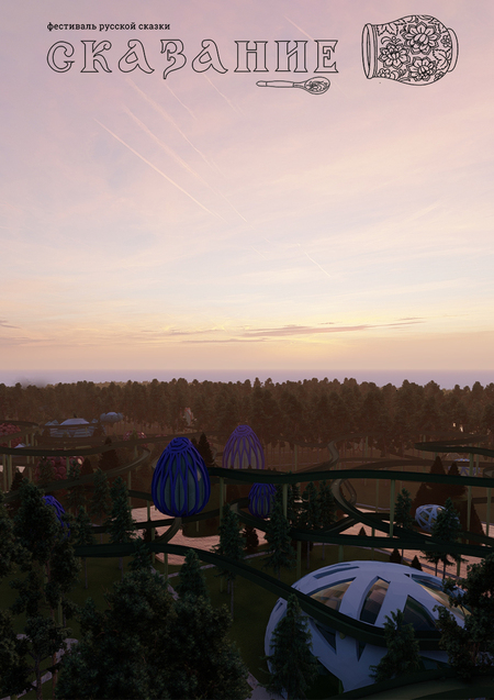 - Сказка «Морозко» — лучший пример модели поведения для детей. Да и взрослых она научит многому. В основе фасада- формы и старославянские символы в иллюстрациях Поленовой к этой сказке. В проекте представлено 4 такие формы разных размеров. Каждый павильон означает свое поведение: добро, зло, смелость, любовь. - Сказка «Кот и Лиса» — самая мудрая и хитрая сказка, на мой взгляд. Кот —весьма хитрый персонаж, однако, лиса- в сотни раз его мудрее. Важно уметь отличать такие два понятия как мудрость и хитрость. Именно поэтому, в проекте гостям встретятся павильон хитрости и павильон мудрости. - Последняя зона полностью переносит нас в сказку «баба -яга». Узор домиков взят с иллюстраций Поленовой к этой сказке, форма напоминает нам ягодку и таким образом превращается в глэмпинг с разными планировками: 1 и 2 этажа, на земле, в земле, в воздухе. Крыша прозрачна, стены автоматически открываются и закрываются в ответ на положение солнца.