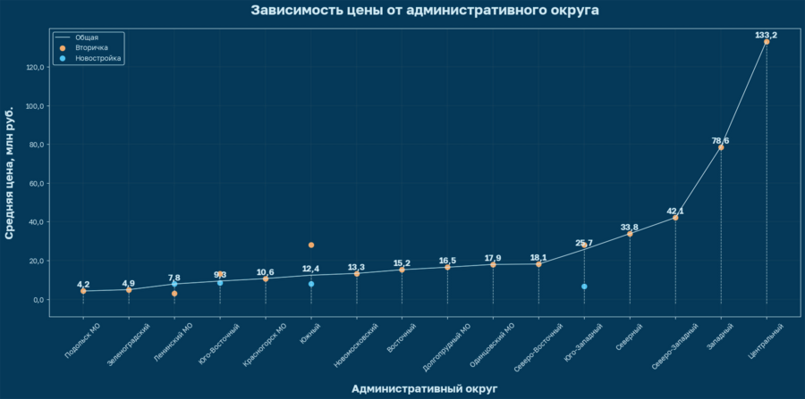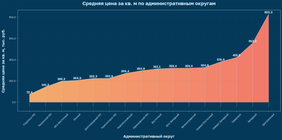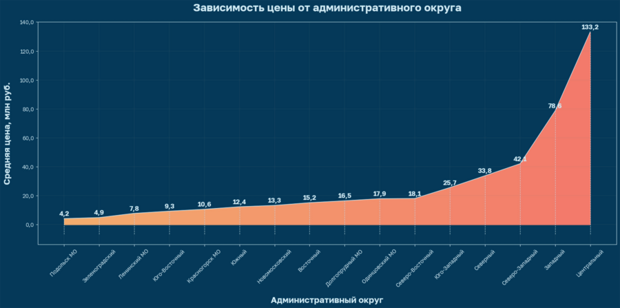 Как и предполагалось, квартиры в центре — самые дорогие. Однако удивительно — насколько. Разница между Центральным и Западным АО, который стоит на 2-м месте по стоимости, почти в 2 раза. Мой родной Северо-Западный на 3 месте с разницей в 90 млн по сравнению с Центральным.