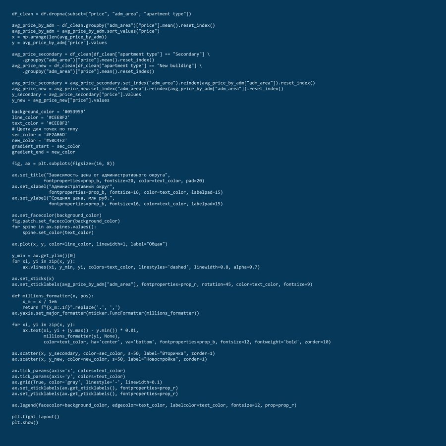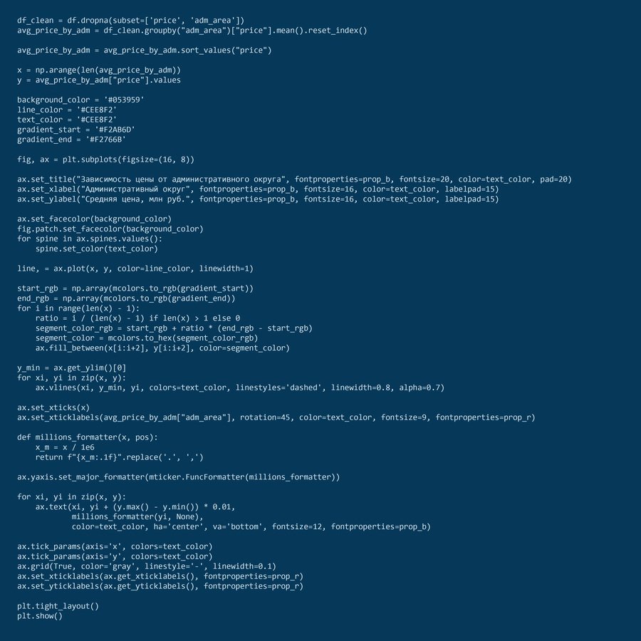 коды для графиков № 1 и № 2. зависимость цены от административного округа