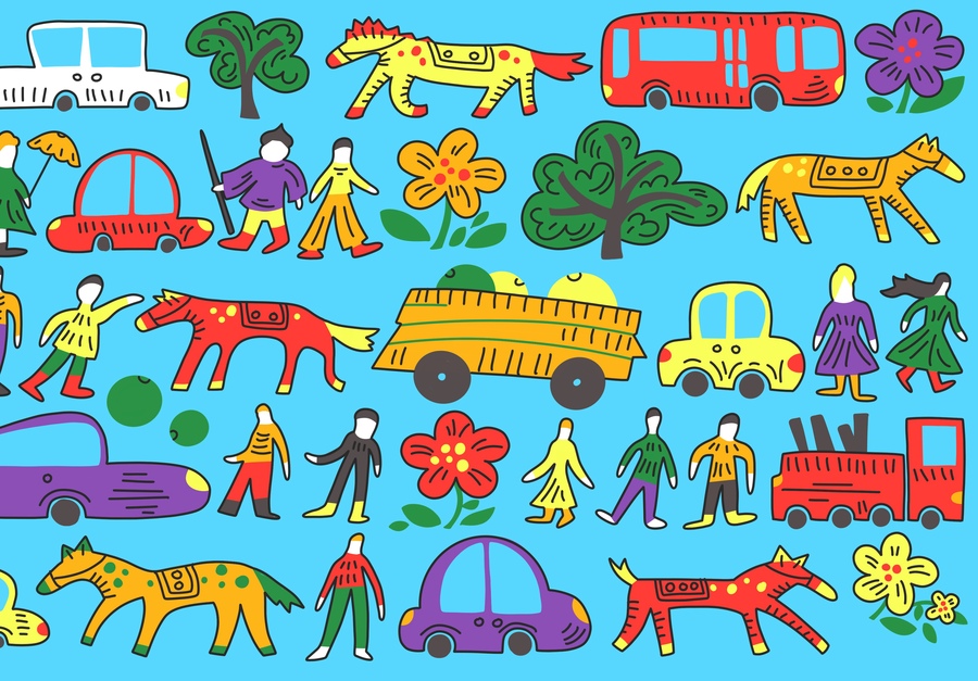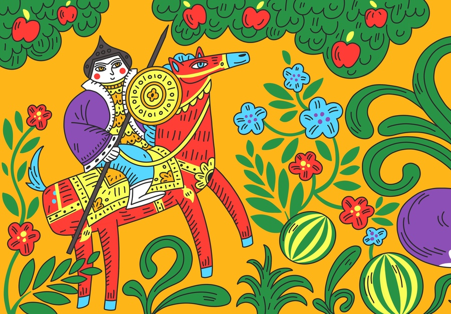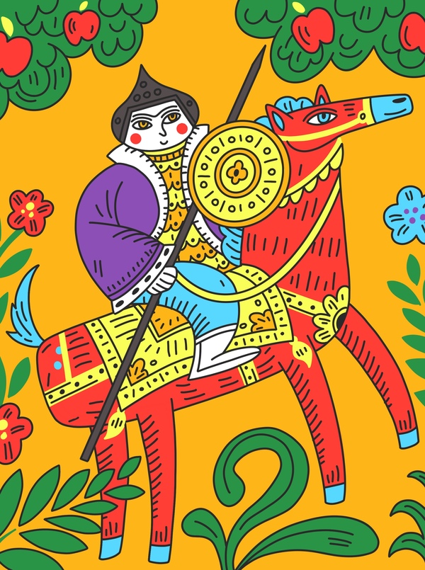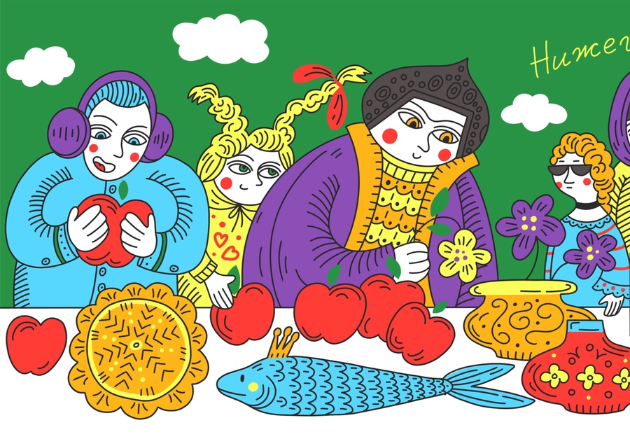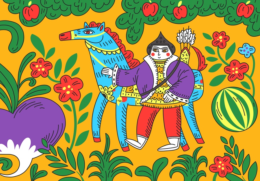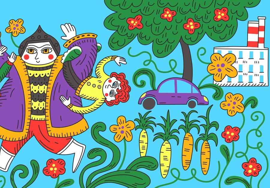 В работе над иллюстрациями я уделяла внимание пластике и масштабности форм на листе. В качестве материалов я использовала плотную однородную заливку цветом, а также тонкий лайн для контура, штриховки, для уточнения мелких деталей. Эти материалы и техника необходимы были для передачи лубкового стиля моим сюжетам, при этом придавая современного диджитал-звучания.