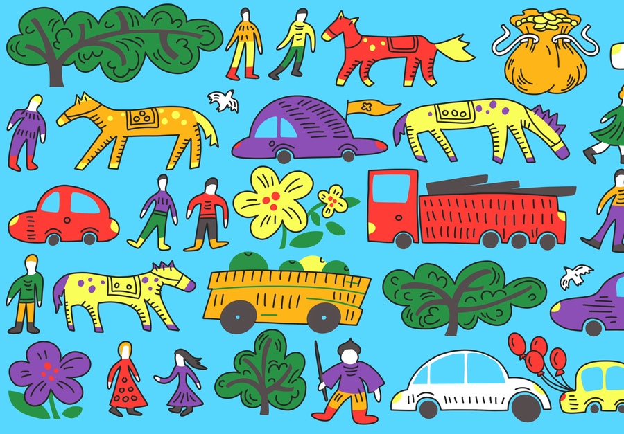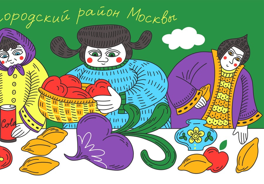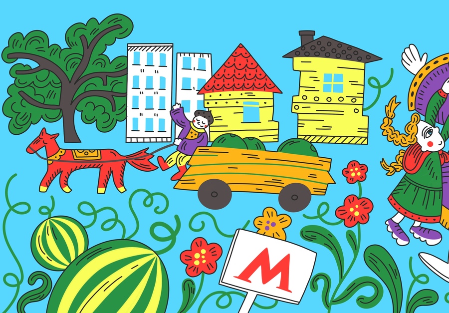 За основу сюжета в иллюстрациях я взяла легенду происхождения названия села Карачарово (от двух татарских слов «кара» и «чура», что по-русски означает «чёрный богатырь»), а также его историю: в древние времена крестьяне занимались здесь огородничеством, а товары продавали на рынке или доставляли на телегах в Москву.