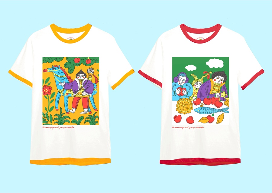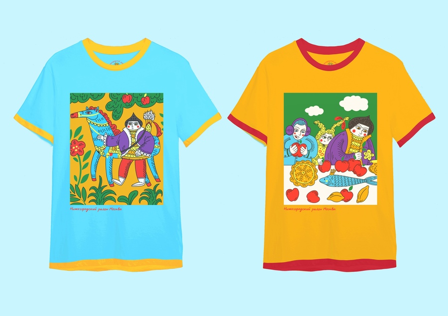 В качестве мерча я разработала дизайн аксессуаров для повседневной жизни, а также несколько вариантов одежды с моими иллюстрациями и логотипом-гербом Нижегородского района.