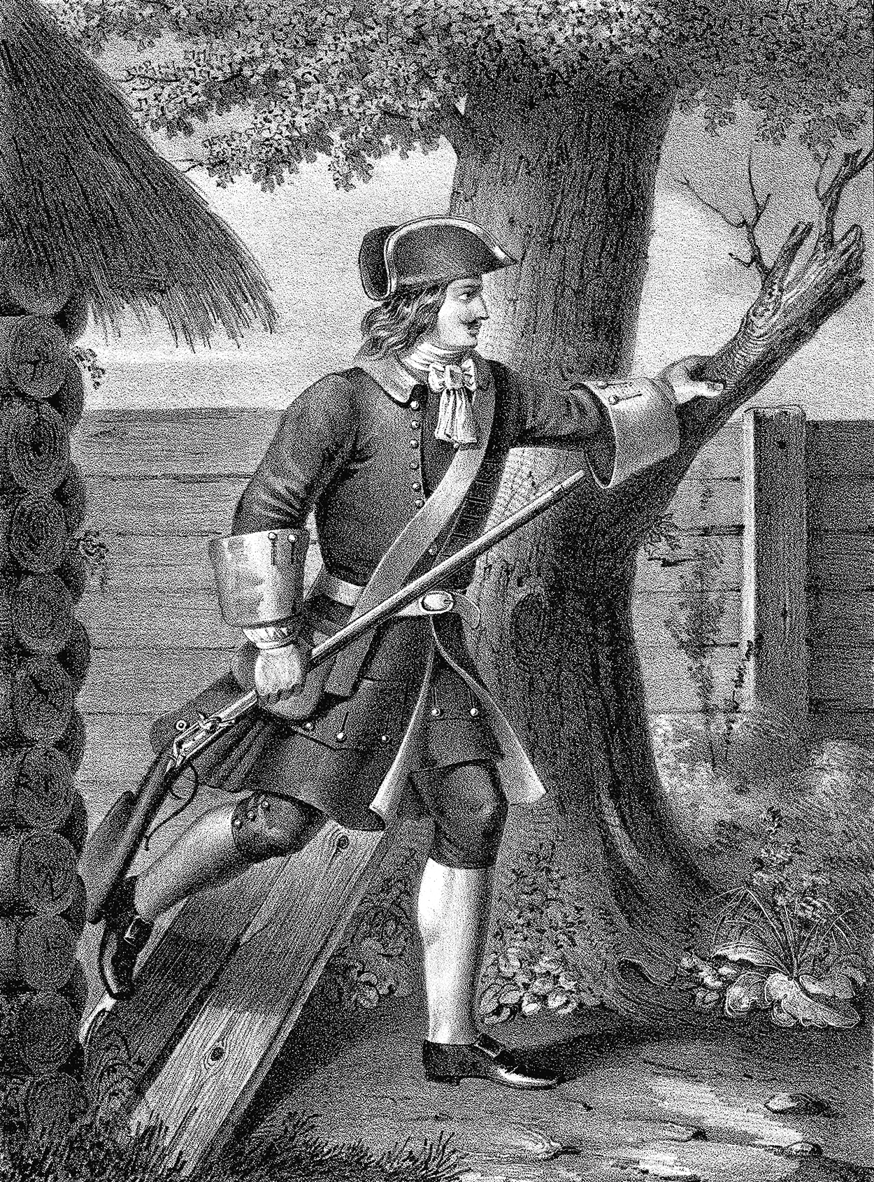 Артур Вильборг. Фузилер Лейб-гвардии Семеновского полка, с 1720 по 1732 год. Гравюра из книги: Александр Висковатов. Историческое описание одежды и вооружения российских войск, составленное по высочайшему повелению. СПб., 1841