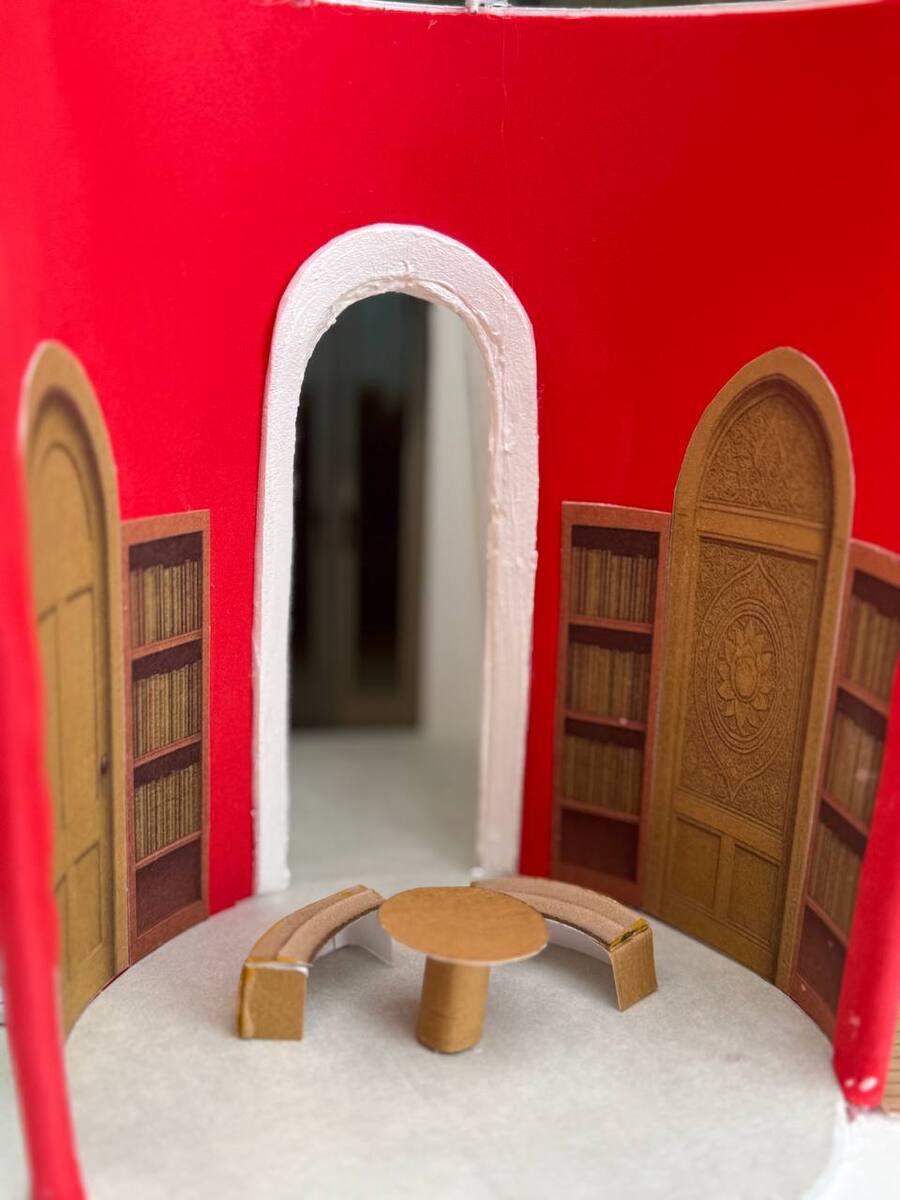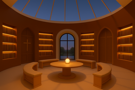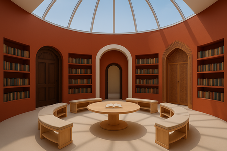 Центральный зал: Сделай визуализацию общего зала, чтобы было видно один коридор Зал должен быть круглый, в центре здания, цвет стен — насыщенный красный В центре купола — остеклённое окно, свет строго сверху На стенах — полки с книгами и религиозной атрибутикой Слева — дверь в христианском стиле, в православной традиции (арочная форма, деревянная, без креста). Справа — дверь в исламском стиле, с резными узорами, арочная форма. Круглый деревянный стол на одной центральной опоре. Вокруг стола — четыре изогнутые лавки с мягкими спинками, светлые, почти формируют круг.