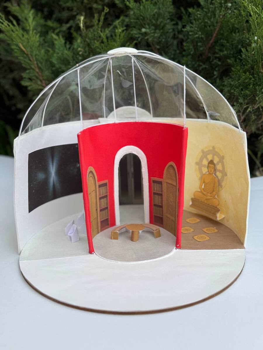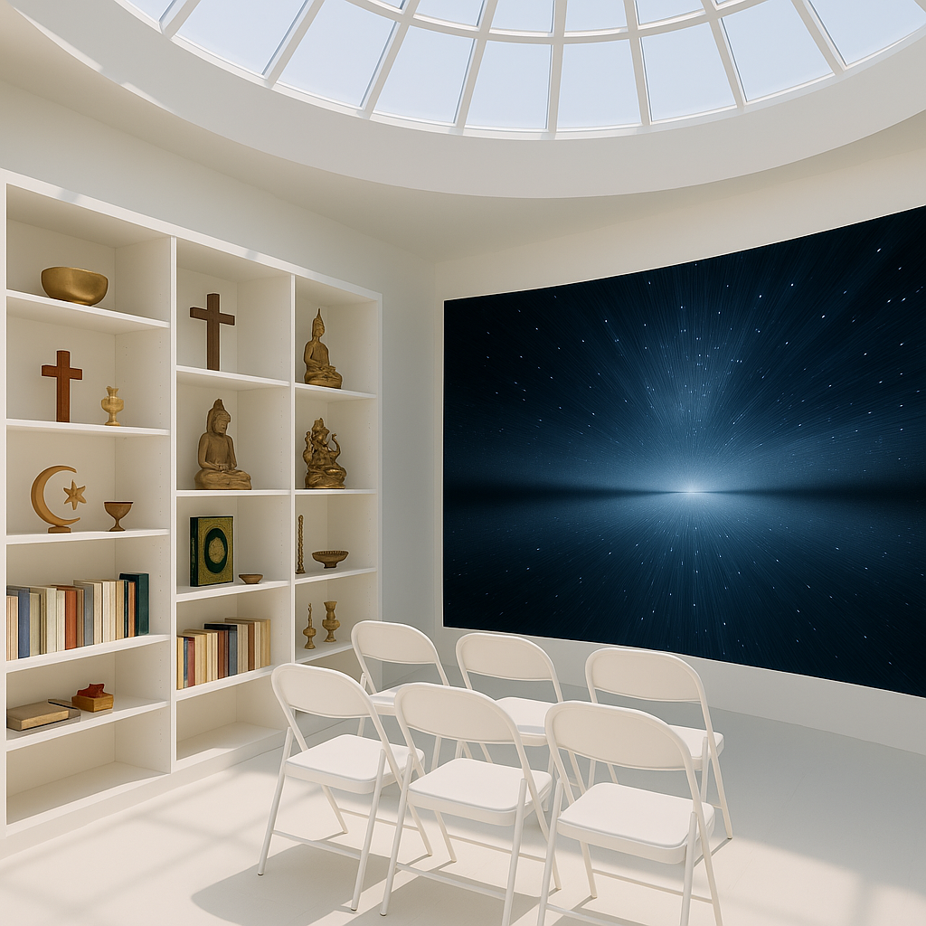 Интерьер лекционной Сделай лекционную комнату, расположенную в одном из секторов купольного здания Комната должна быть светлой, нейтральной по стилю, без символики Цвет стен и пола — белый Потолок стеклянный, чтобы проходил естественный свет Добавь стулья из прикрепленного изображения Добавь шкаф во всю стену справа. В шкаф поставь книги и религиозную атрибутику всевозможных мировых религий Добавь большой проектор на изогнутую стену Замени экран на прикрепленное изображение
