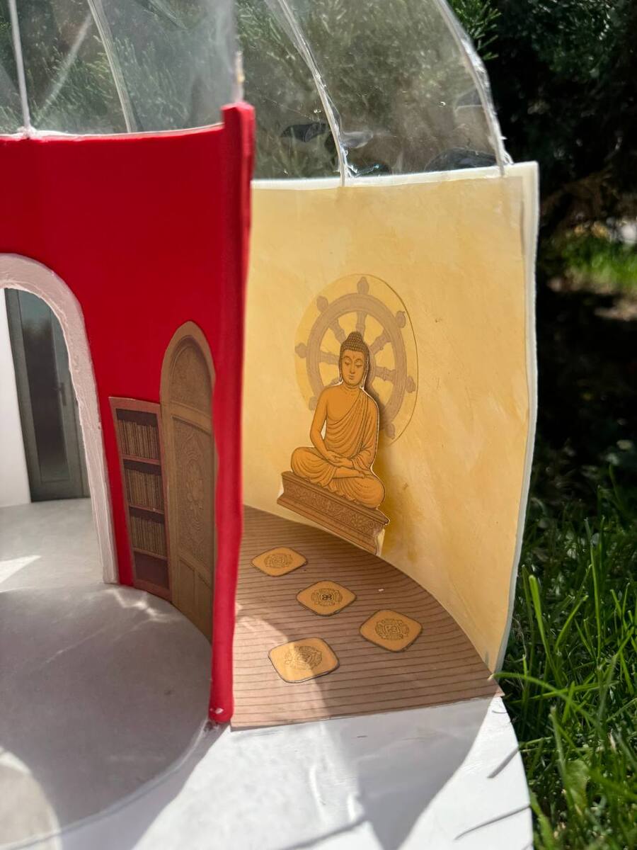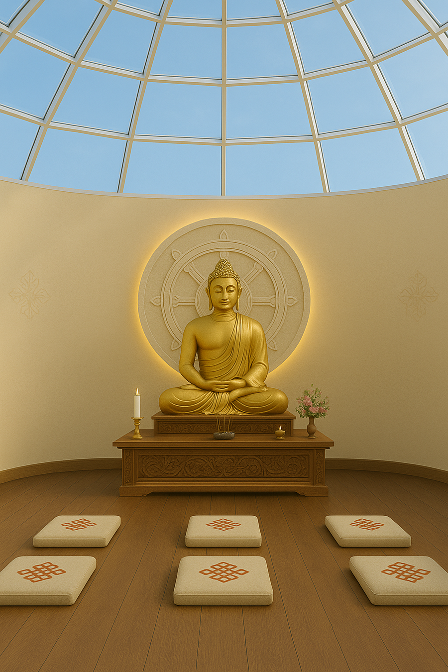 Интерьер по канонам буддизма Убрать арку над Буддой Убрать стол и подушки Сделать Будду золотого цвета Осветлить стены Убрать круглую деревянную платформу Положить квадратные подушки для молитвы Сделать стены однотонными За Буддой сделать круг: рельефный, выступающий, с подсветкой по краю и вырезанным колесом Дхармы в цвет стены Посадить Будду на резной деревянный алтарь, украсить свечами, благовониями, цветами Сделать стены светло-песочного цвета, пол — тёмное дерево Добавить больше подушек, увеличить видимую площадь комнаты Сделать роспись на стенах меньше, убрать роспись с купола, убрать крайние подушки Подсветить круг за Буддой лучше, сделать на нём рельефное колесо Дхармы Разместить подушки аккуратно: 3 по горизонтали, 2 по вертикали