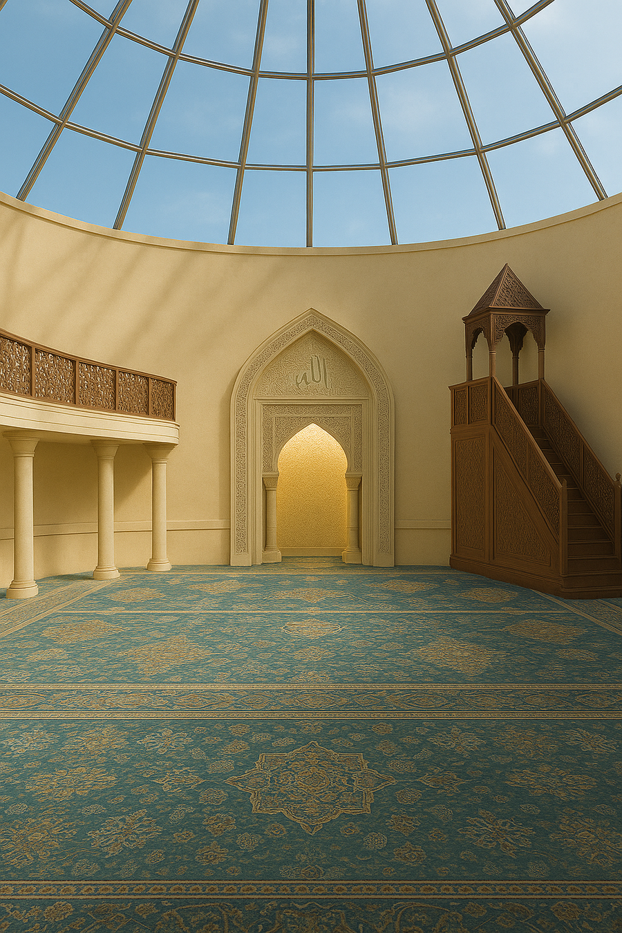Поставь минхраб в центр и минбар справа от него Сделай подсветку ниши с минхрабом Сделай светлее картинку, ясное небо, день Оставь синий цвет ковра, но сделай больше узоров в мусульманском стиле. На стенах надписи из Корана Убери надписи из Корана. Слева сделай небольшой балкон. Оформи перила как в мусульманских мечетях Поставь минхраб на место в центр Балкон большой, он идет вдоль всей стены слева по кругу комнаты, снизу его держат колонны Я нарисовала схему. Расположи балкон, минбар и михраб соответствуя этой схеме (прикреплена схема центра) Балкон идет вдоль левой прямой стены и упирается в угол стены со скруглением.