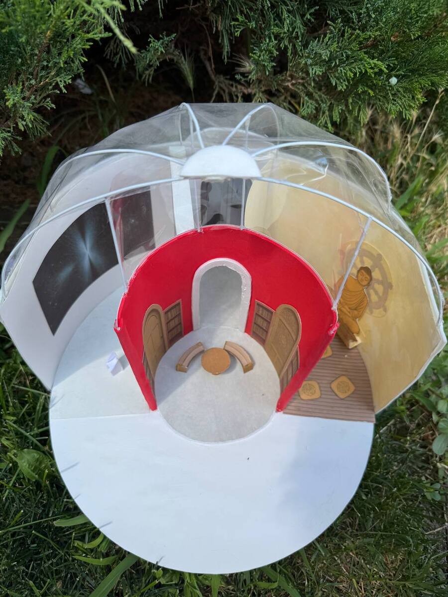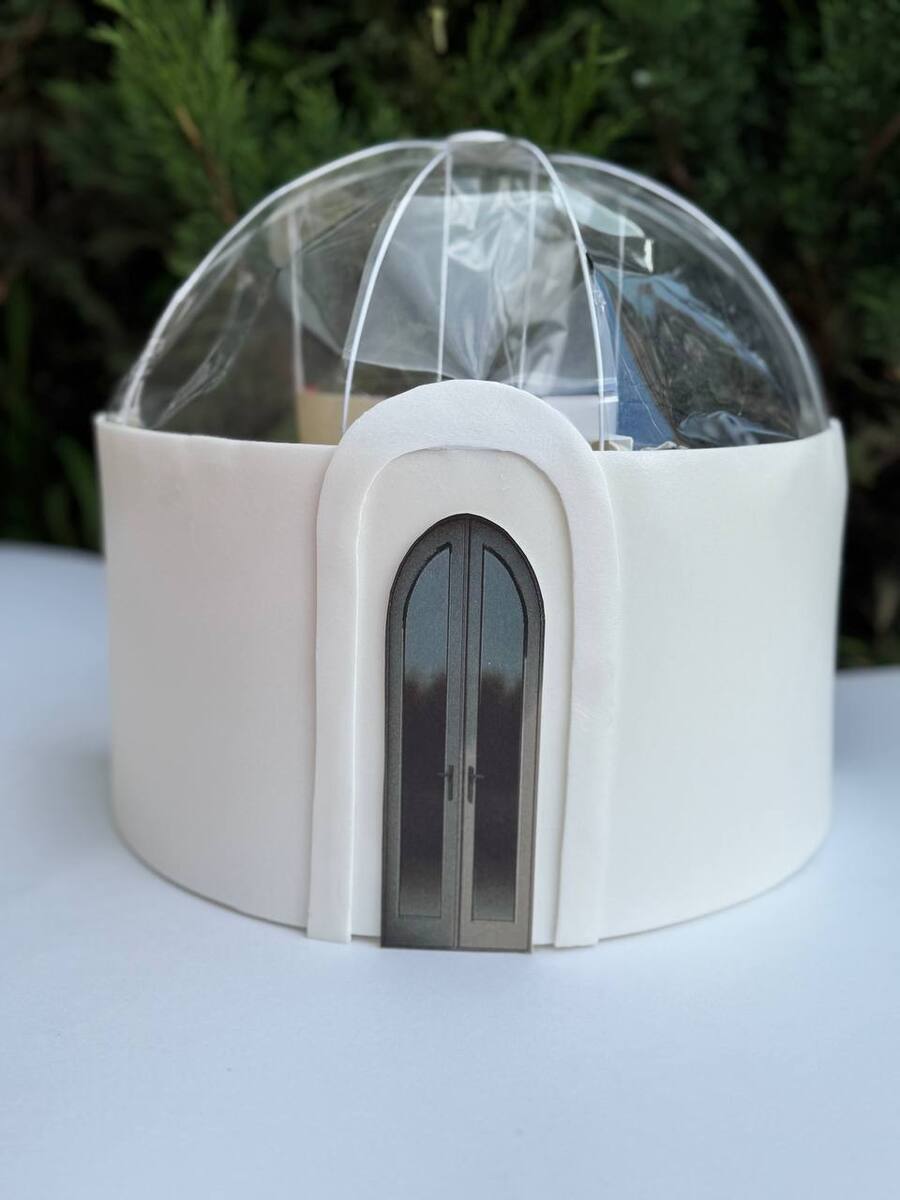 Сделай здание в форме полусферы, белого цвета Верх здания — стеклянная крыша, должна начинаться с 45 градусов Крыша — продолжение полусферы, а не отдельный элемент Сделай стеклянную крышу из «долек», как у геокупола Арка над входом должна быть тоньше Уменьши дверь, дверной проём и арку Арку сделать вровень с дверью по ширине Убрать ступени Сделать двери вытянутой формы, с аркой сверху Сделать стеклянную дверь, арку и проём — в одной линии Убрать арочный проём над дверью Сделать арку по размеру двери Вернуть арку над дверью Сделать арку ближе к дверям Заменить дверь на стеклянную с вытянутым сводом, вровень с аркой