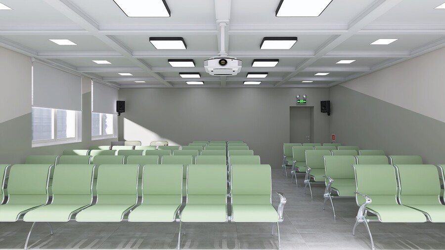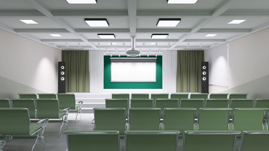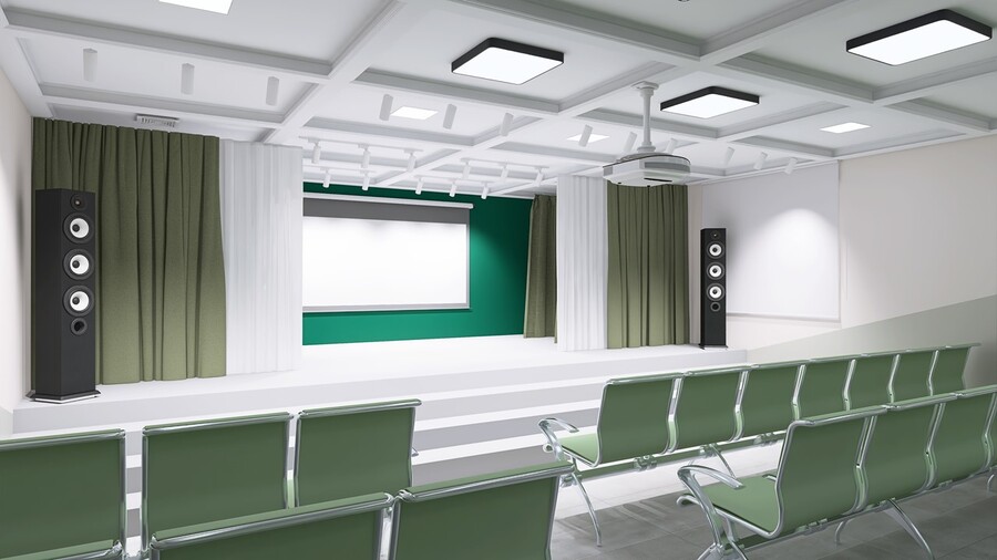 Актовый зал школы № 9/31 разделён на зону сцены, зрительскую зону и зону управления. Спокойные цвета способствуют концентрации внимания, что в данном помещении крайне важно. Учтены все требования к техническому оснащению, для обеспечения качественного проведения мероприятий. Настенная графика выполнена направленно на сцену, чтобы внимание зрителей было приковано к сцене. Стулья скреплены между собой для обеспечения безопасного передвижения во время эвакуации.