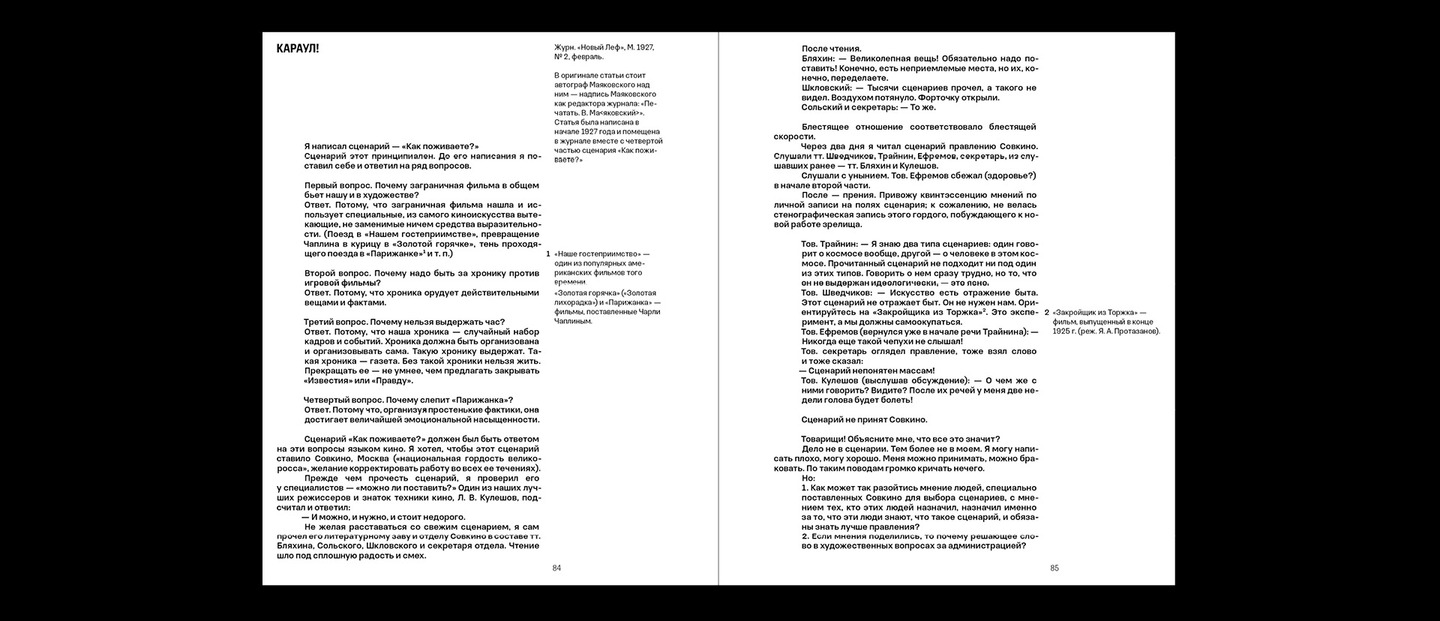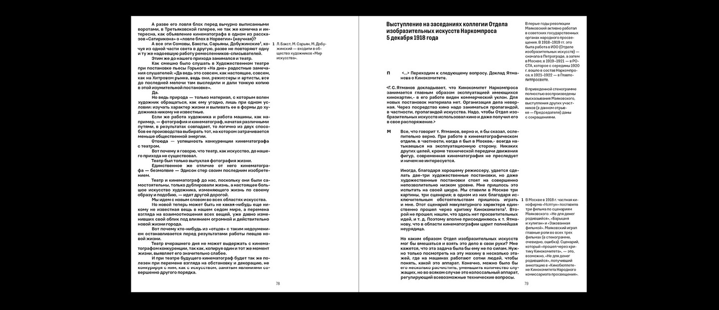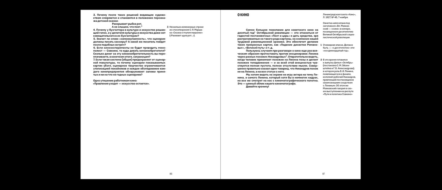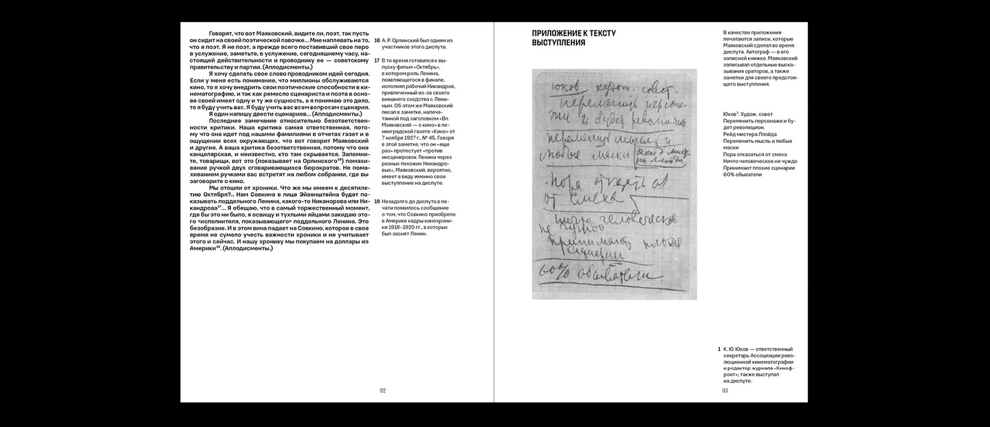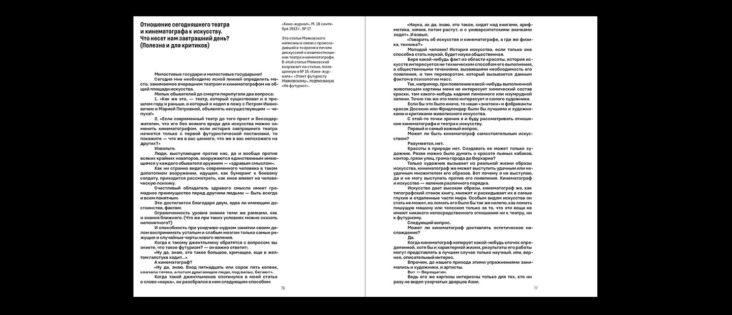 В конце книги располагается блок критических статей Маяковского о кино, в начале каждой дается сопроводительная информация