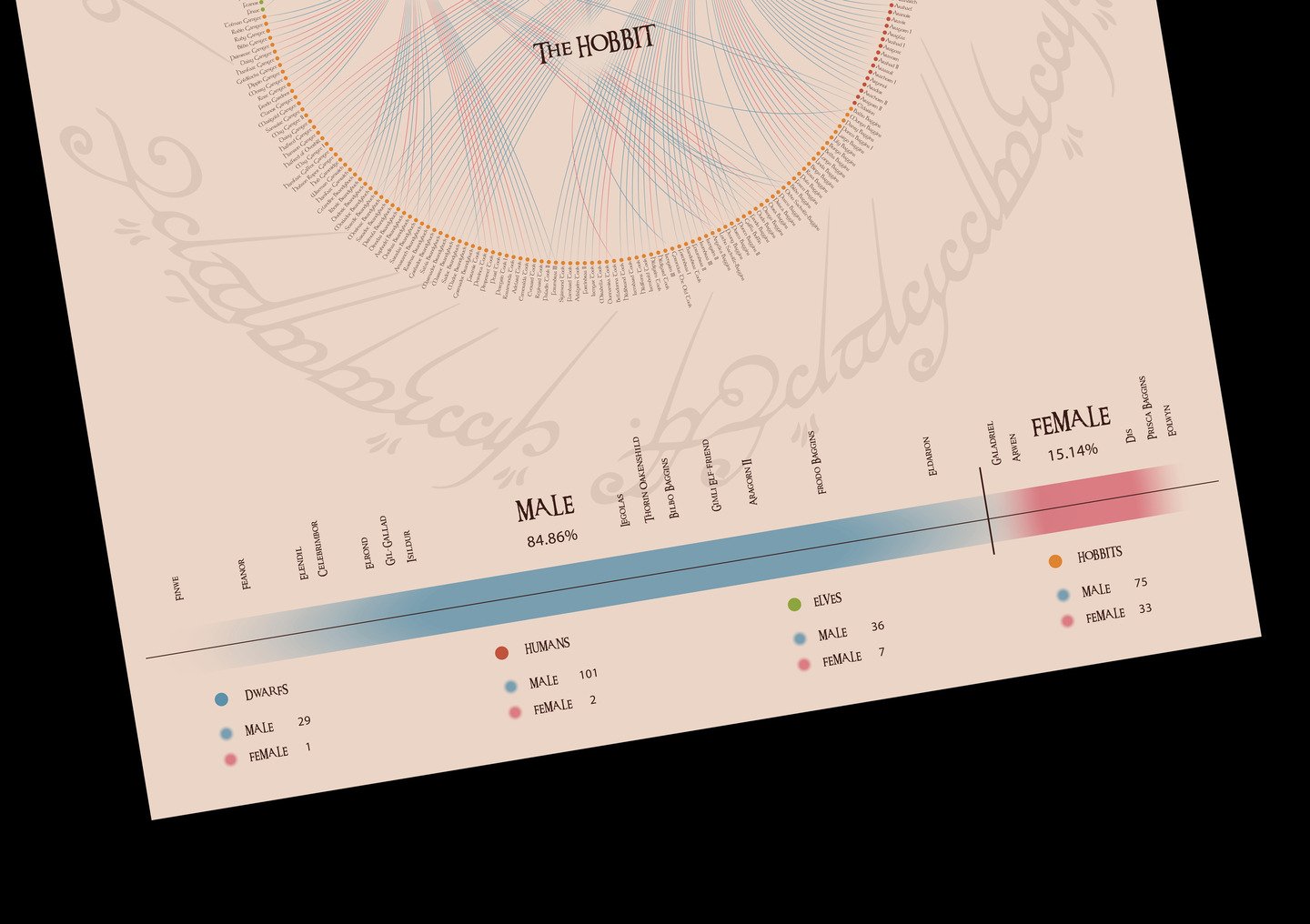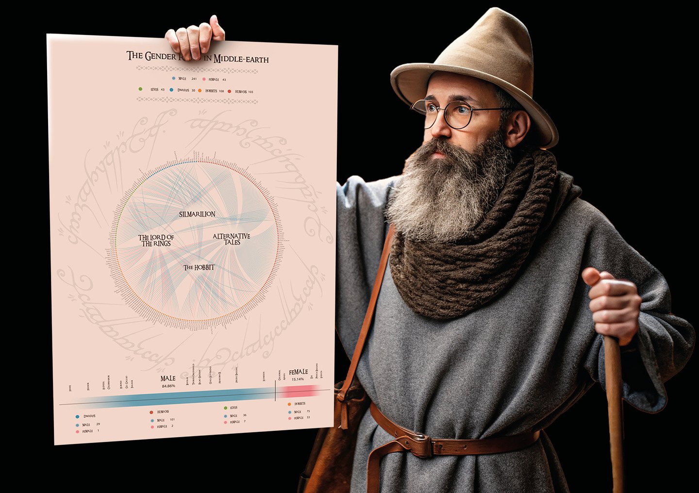 Визуализация данных по вселенной Толкина: распределение персонажей по книгам, родам и гендеру.