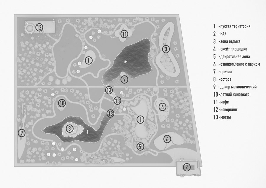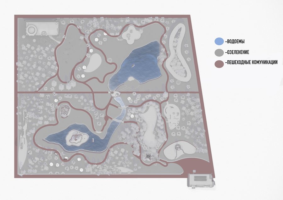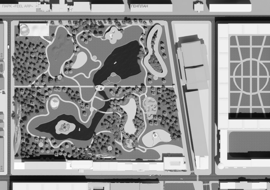 Предполагаемый парк по мотивам работ Ханс Арпа, расположенный по адресу Пречистенка 21, был вдохновлен мягкими формами художника и его идеей случайности. Парк не имеет конкретного маршрута, поэтому посетители парка могут составить свой собственный. Дорожки в парке расположены случайным образом, а планировка зон спланирована коллажами дадаиста. Истоки от художника вырождаются через мягкие формы Арпа, элементы ландшафта напоминают органическую природу мира и придают парку гармонию, металл является акцентом в парке, отражая округи. Мне как автору, хотелось сделать свободный парк, без уточнений и конкретизаций, немного фантастики и воздуха.