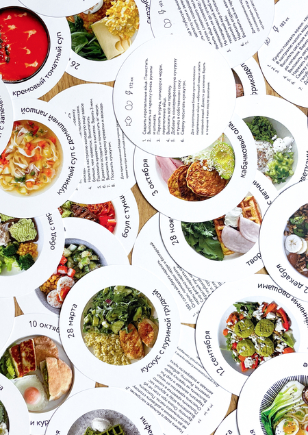 Кулинарный календарь — это проект, который был создан с целью помочь людям разнообразить их рацион и помочь решить вопрос: «Что приготовить в этот раз?». Календарь состоит из 52 круглых карточек, что соответствует 52 неделям в году. Диаметр каждого календарика — 10 см. Каждая карточка двусторонняя. На лицевой стороне — фото и название блюда. На оборотной стороне — рецепт.
